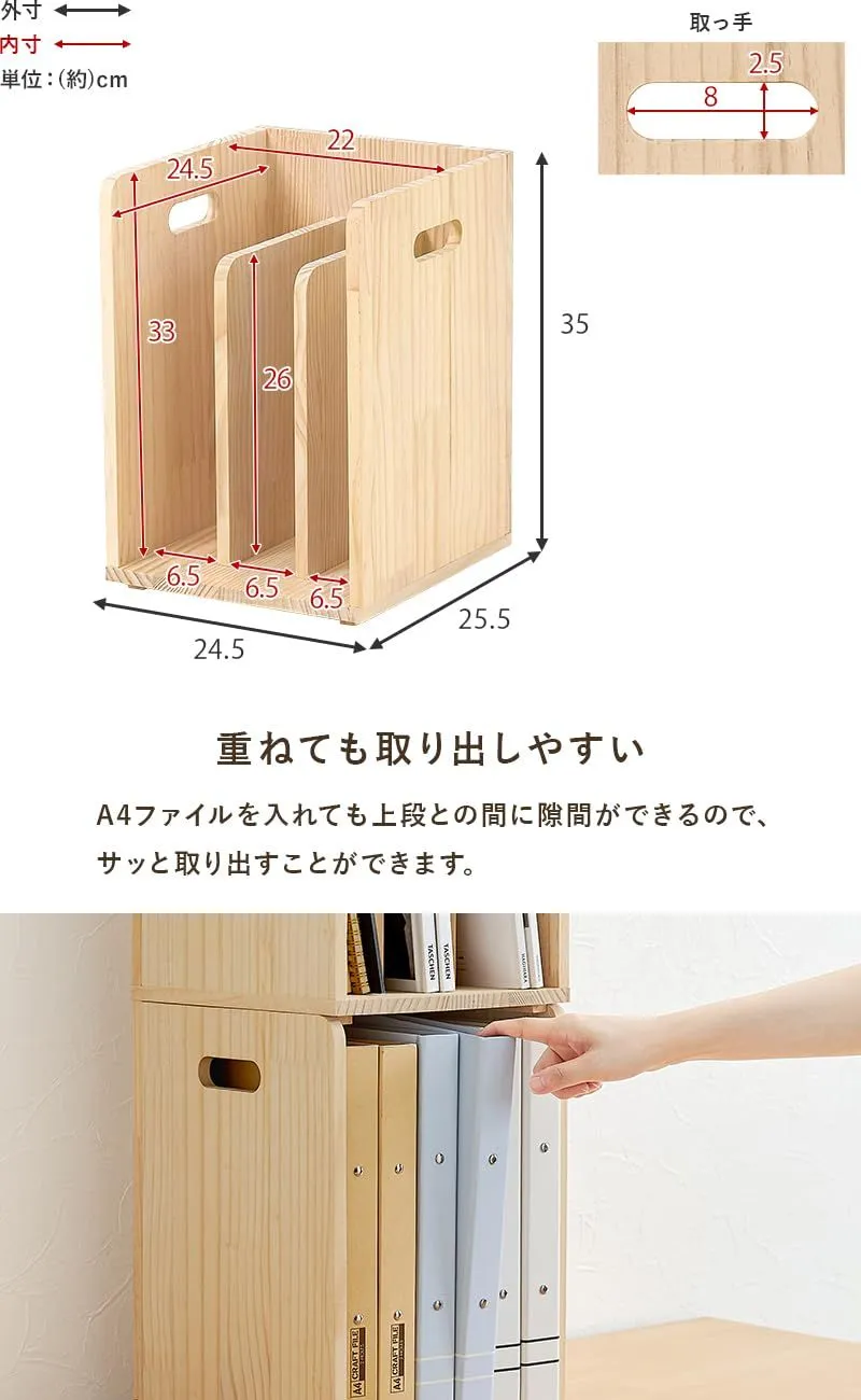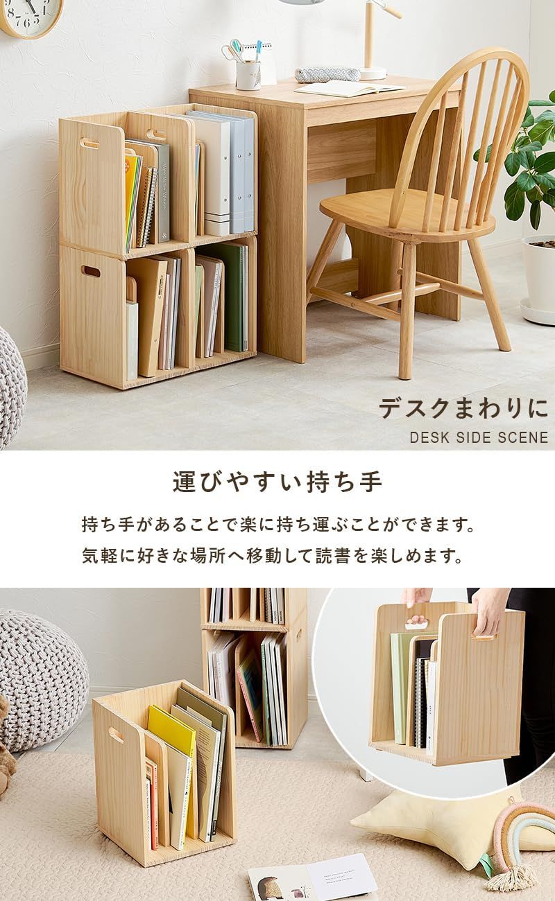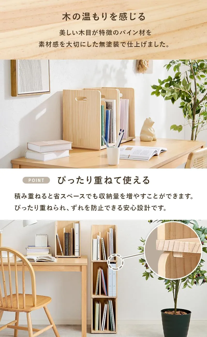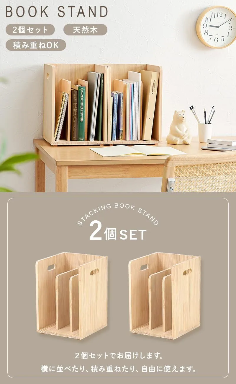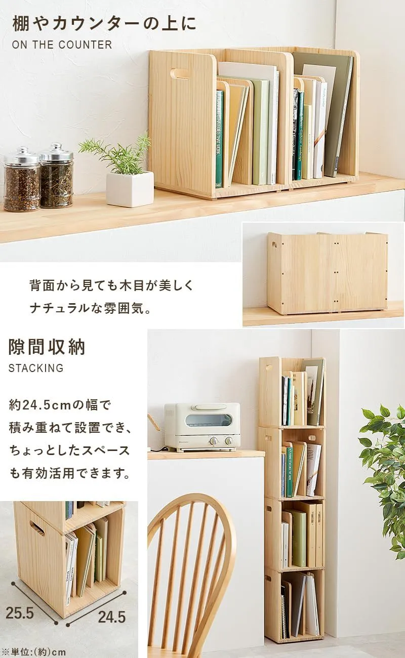 【商品サイズ(約)】幅24.5×奥行25.5×高さ35cm(2個セット) 本や雑誌などを収納できる木製のブックスタンドの2個セット。 A4サイズが入るので、本立てやマガジンラックをお探しの方にオススメ。 スタッキング式なので重ねて省スペースに隙間収納も可能です。 ベッドやソファの横においてサイドテーブルにも!組み合わせ自由自在で、自分好みのレイアウトが楽しめるアイテム。 本や雑誌などを収納できる木製のブックスタンド。 A4サイズが入るので、本立てやマガジンラックをお探しの方にオススメ。 スタッキング式なので重ねて省スペースに隙間収納も可能です。 ベッドやソファの横においてサイドテーブルにも! 組み合わせ自由自在で、自分好みのレイアウトが楽しめるアイテム。 無塗装の木材を使用しているため、ペンキを塗ってアレンジも楽しめます。