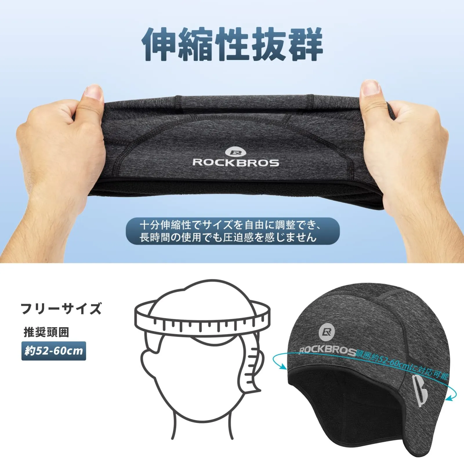 【通気性&反射加工付き】ソフトな肌触り、通気性もよく、汗をより速く蒸発させ、装着感は暖かくて快適です。インナーキャップのROCKBROSロゴとメガネ穴のまわりは反射加工付き、夜間の安全性も高ます。