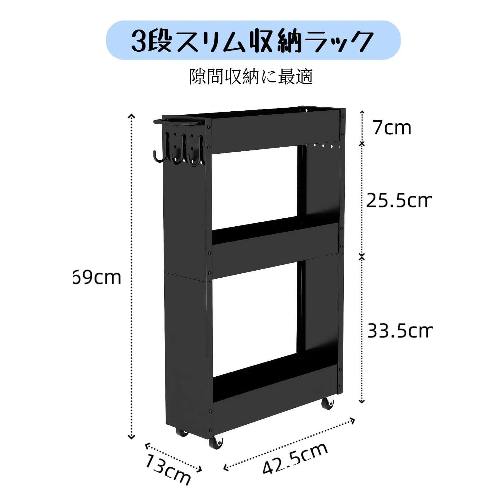 スリム キッチンワゴン 13cm キャスター付き 3段 隙間収納ラック 調味料 洗面所 洗濯機 冷蔵庫横 ペットボトル 細い棚 スチール 幅13×奥行42.5×高さ69cm 黒