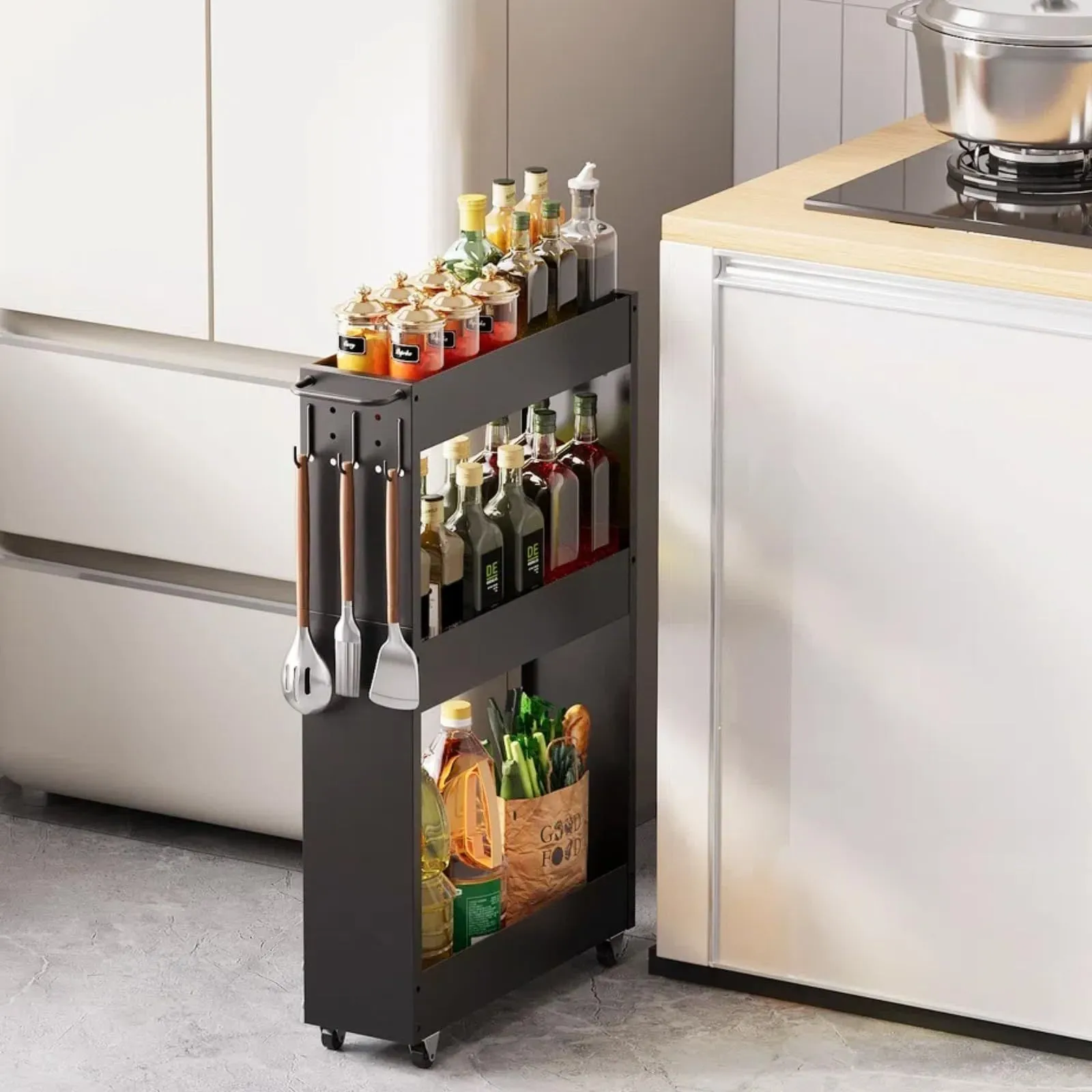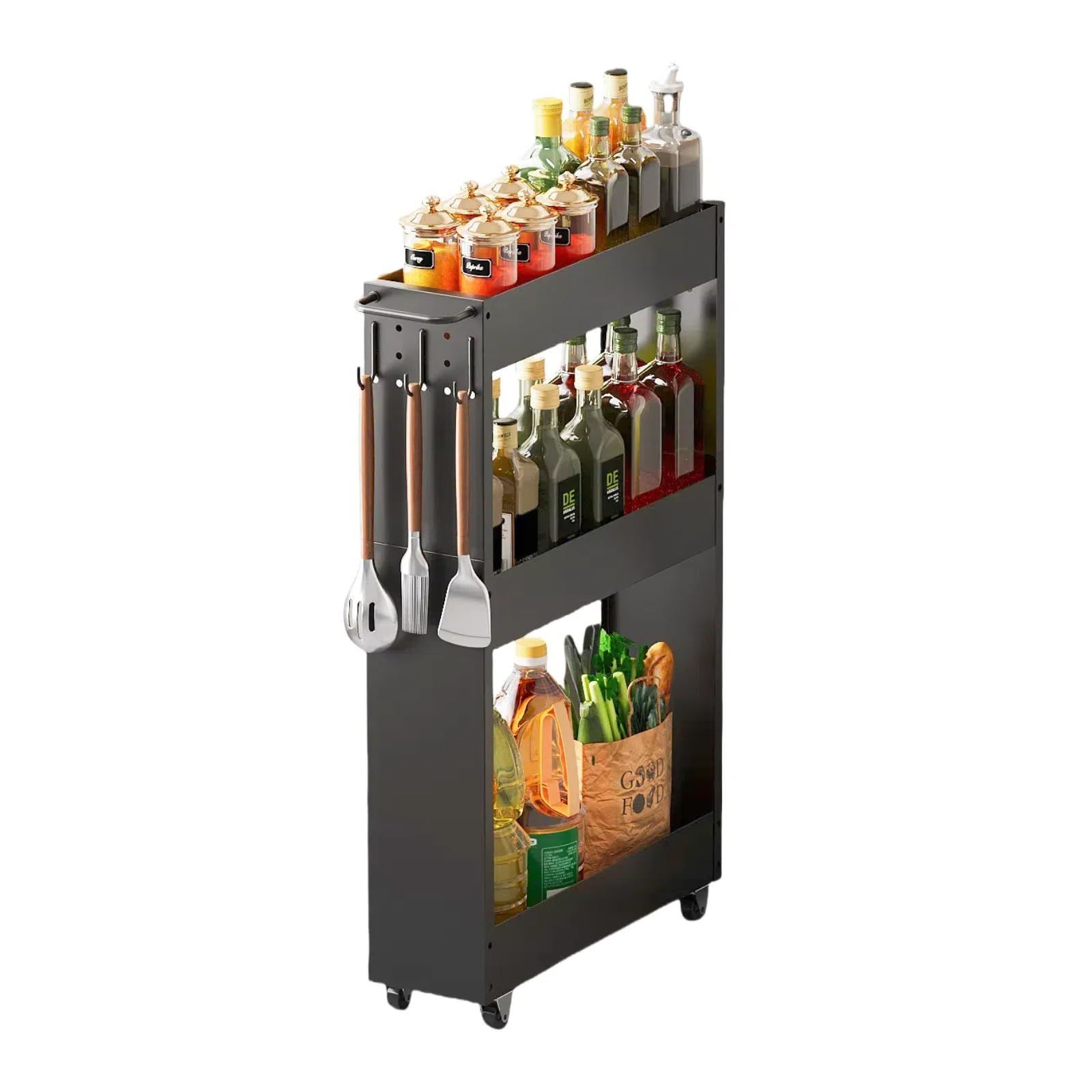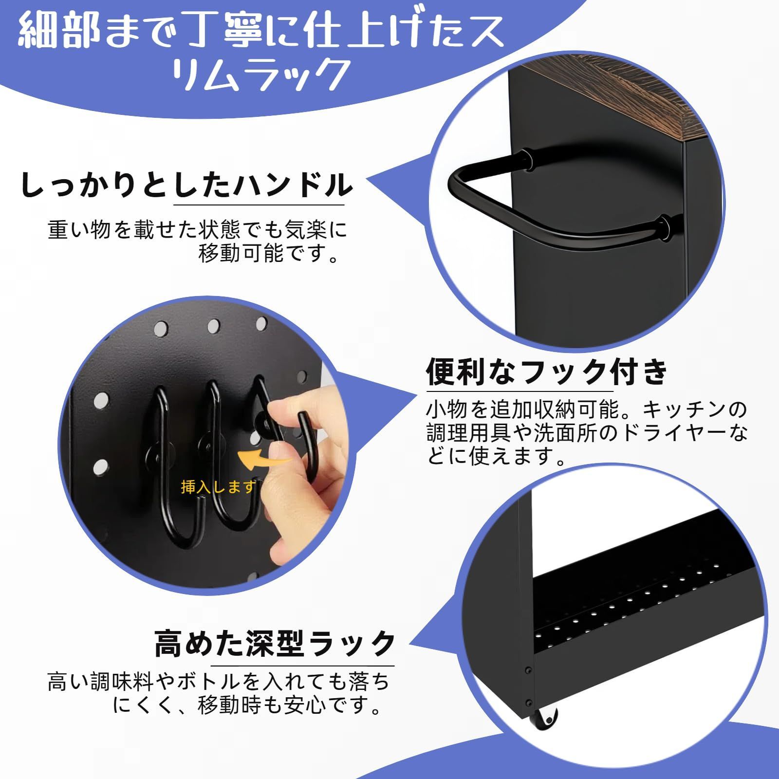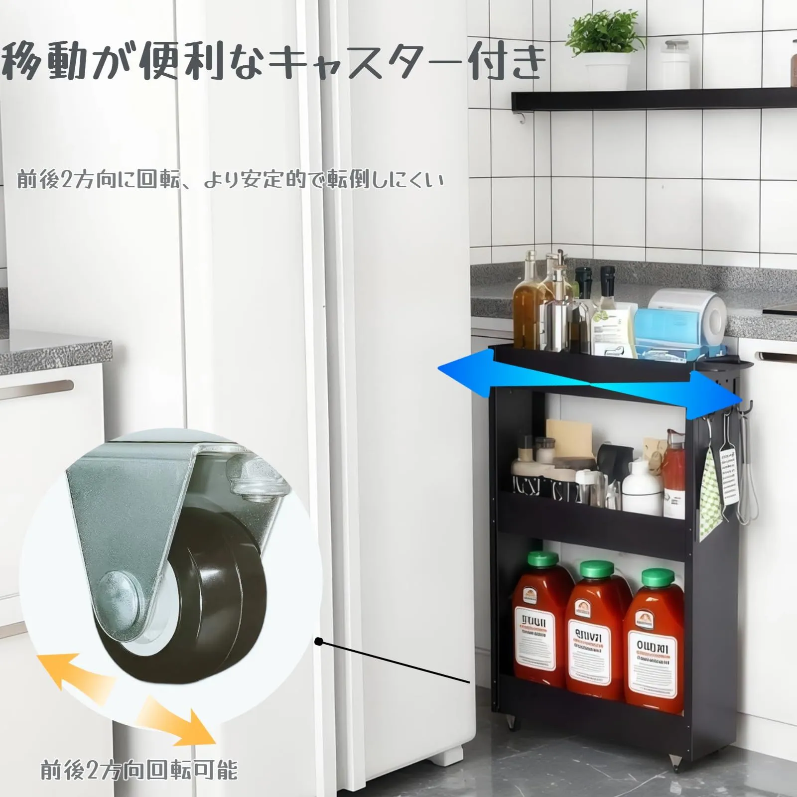 【フック付き隙間ラック】キッチンワゴンで調味料・ペットボトル・洗剤・化粧品・文房具など、多様なアイテムが整理しやすくなります。コンパクトサイズながらも高さを活かした三段構造で収納力を高まります。キャスター付きワゴンで収納物の重さや種類に合わせて分け収納可能、探しも取り出しもラクラクです。フック付きで収納力がさらにアップし、キッチン用品や洗面所小物を整理するのに最適です