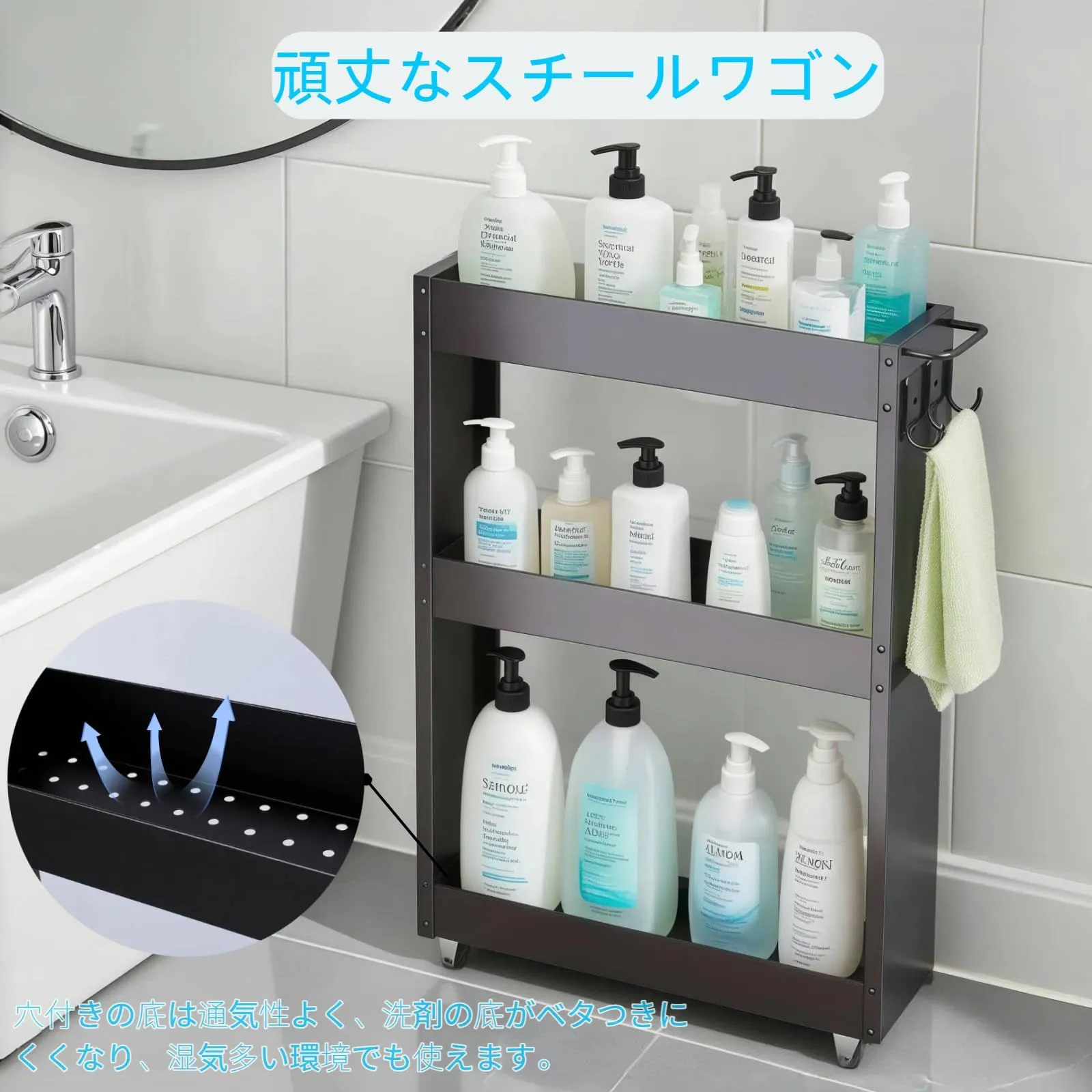 【頑丈で長持ち】金属製のスリムストッカーは頑丈で安定性抜群です。洗剤・米びつ・本など重い物もしっかり収納します。キッチンカートの穴付きの底は通気性よく、調味料や洗剤の底がベタつきにくくなり、浴室や洗面所、台所の湿気多い環境でも安心して使えます。錆に強く、耐久性に優れています