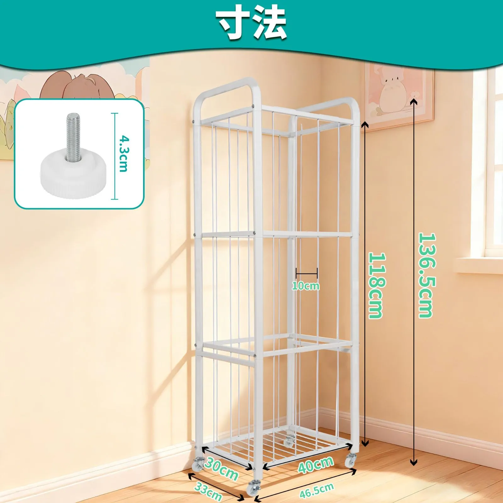 移動と固定の2つのモード:この収納ラックは、さまざまなニーズに対応する2つの固定オプションを備えています。4つのユニバーサルキャスター(そのうち2つはブレーキ付き)を装備し、ラックはどこにでも簡単に移動でき、必要に応じて簡単に固定できます。移動が不要な場合は、付属の金属製の脚を取り付けることで安定性を高めることができます。さらに、付属の金属製の転倒防止ストラップがラックをしっかりと固定し、転倒による怪我を防ぎ、安全に使用できます。