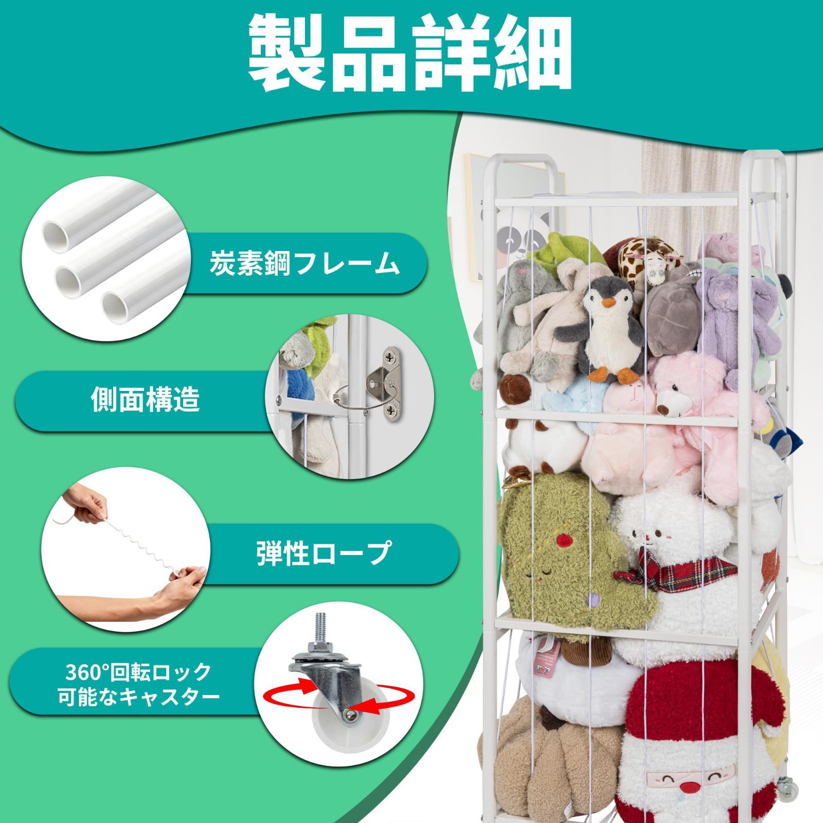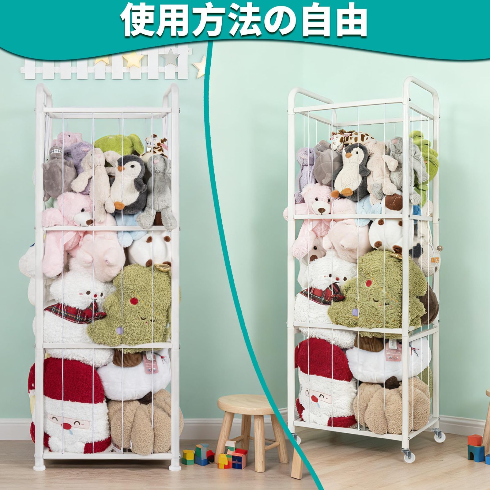 高品質素材:ぬいぐるみ収納ラックのメインフレームは炭素鋼製で、強度と耐荷重性に優れ、たくさんのぬいぐるみの重量を楽々と支えます。赤ちゃんのように柔らかい伸縮性のあるコードがぬいぐるみをしっかりと固定し、揺れや散乱を防ぎ、おもちゃ収納ラックの安定性を確保します。