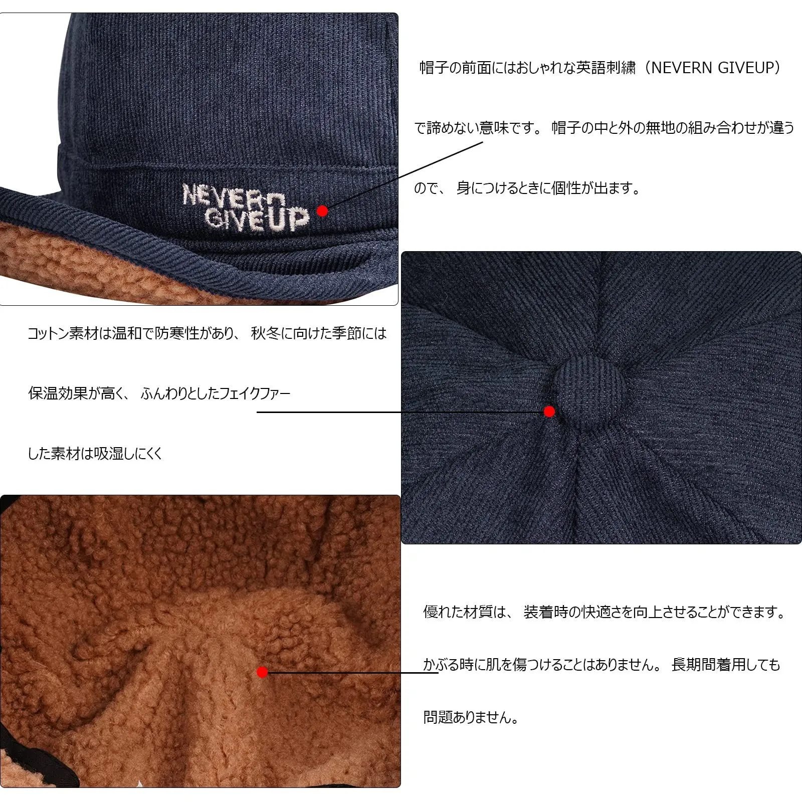 斬新なデザイン:立体的な刺繍デザイン、帽子の前面にはおしゃれな英語刺繍(NEVER GIVEUP)で諦めない意味です。帽子の中と外の無地の組み合わせが違うので、身につけるときに個性が出ます。