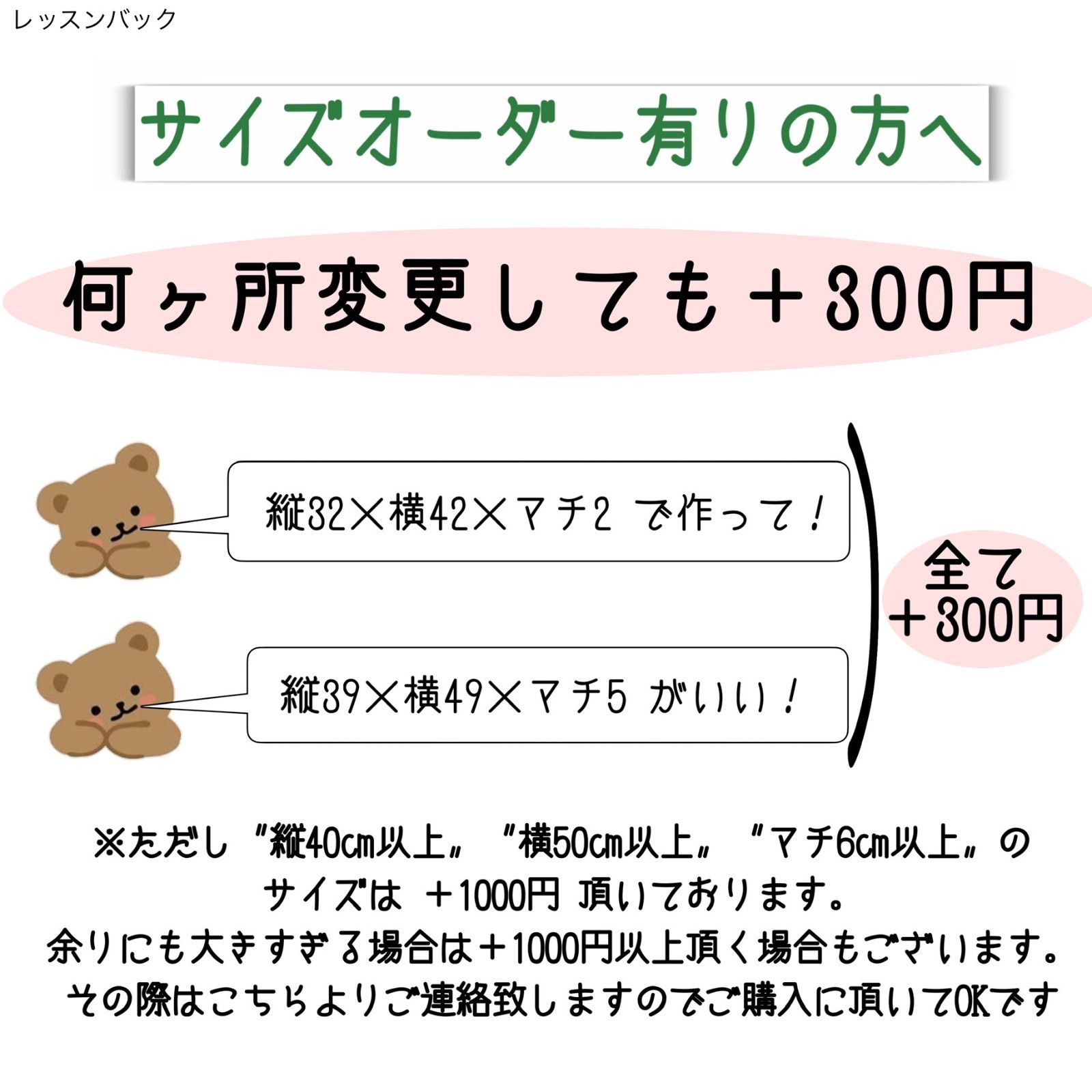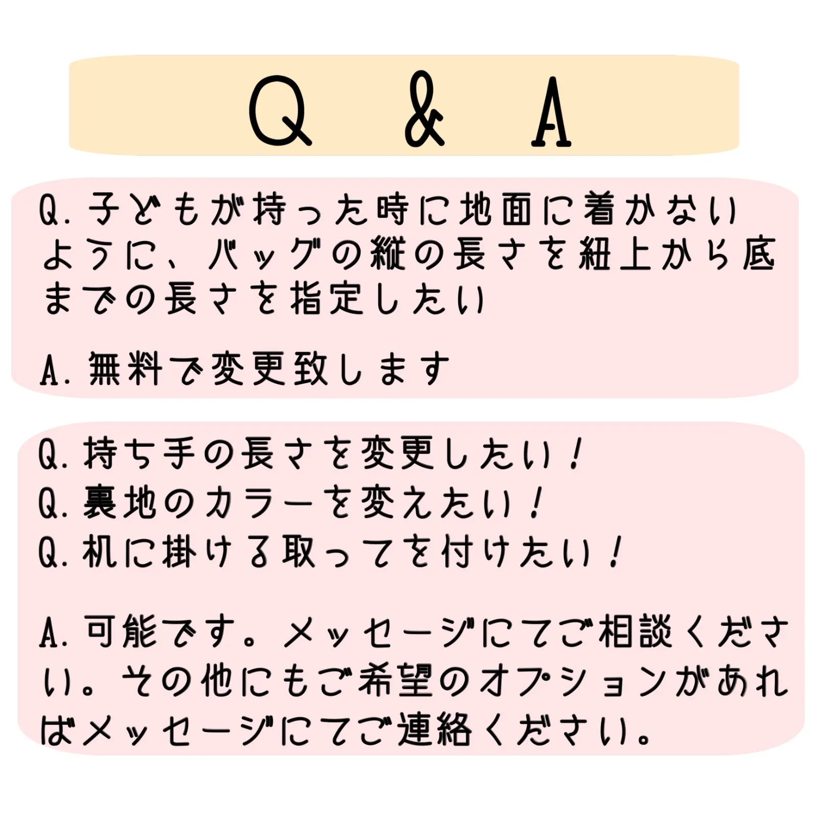 【サイズオーダーについて】 ・サイズ変更なし:無料 ・サイズ変更あり:\何ヶ所でも+300円/ (例)縦の長さのみ変更→+300円/縦×横×マチすべて変更→+300円 ※縦40cm以上/横50cm以上/マチ6cm以上は+1,000円〜(事前にご連絡致します) ▶︎ご希望サイズは購入時の「備考欄」または「メッセージ」へ