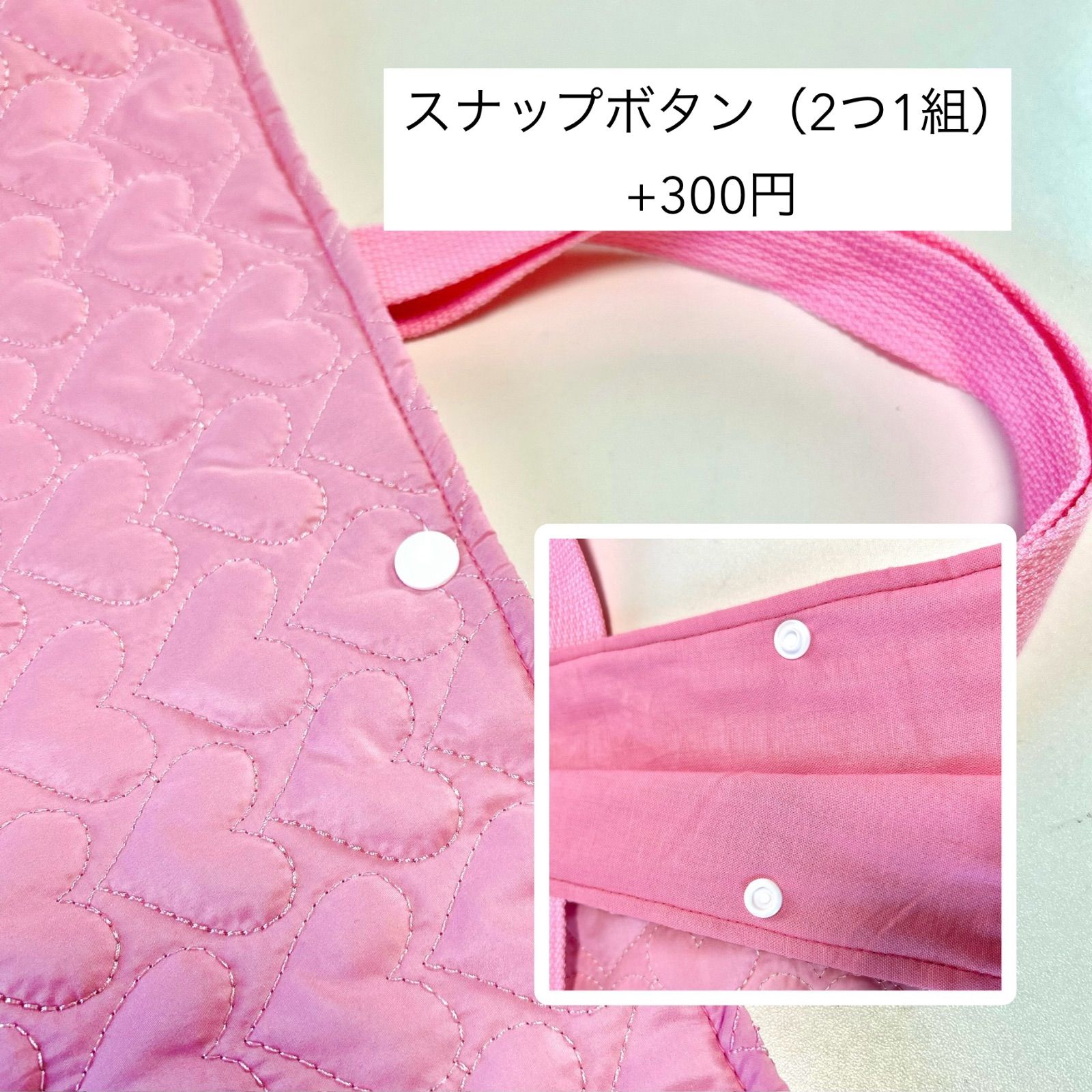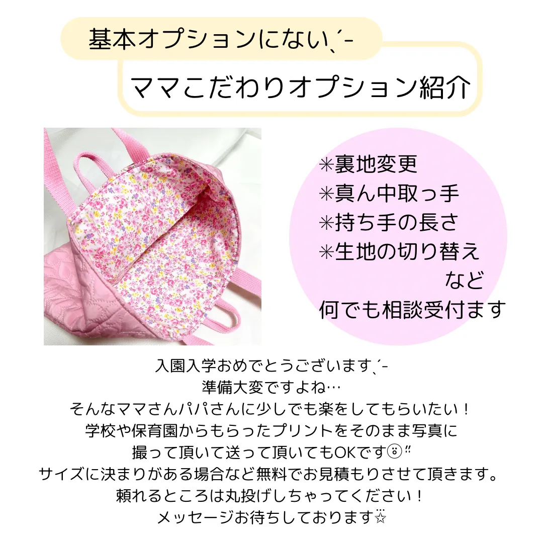 【グレードアップ追加オプション】 内ポケット¥500/外ポケット¥500/スナップボタン¥300/裏地変更¥300/マジックテープ¥300〜/持ち手カラー変更¥300/机かけフック¥300/肩掛け仕様¥300〜 ※組み合わせや他のオプション希望もOK