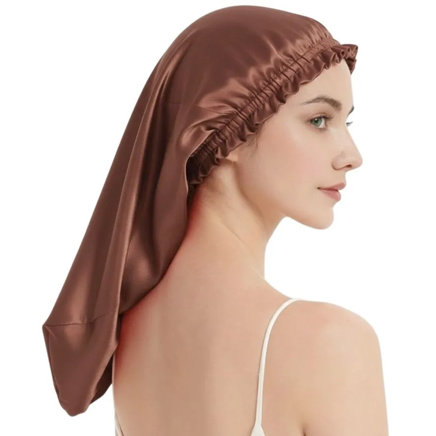 ナイトキャップ ミドルロング ブラウン シルク調 ポリエステル100% 就寝時用 ヘアケア ヘアキャップ 摩擦軽減 丸洗いOK フリーサイズ