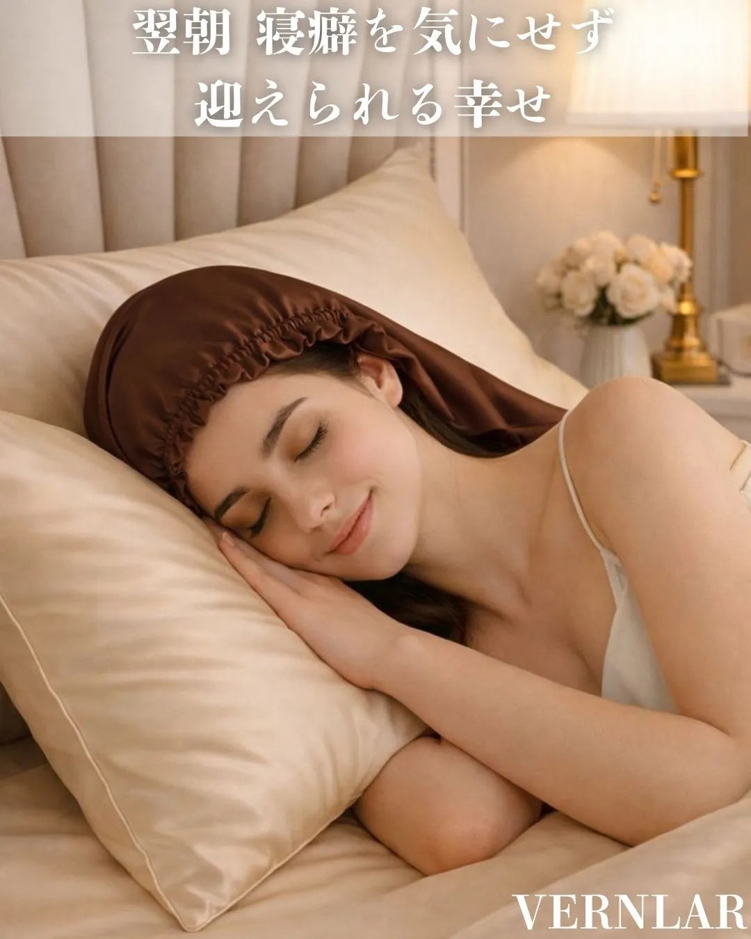 【就寝時用ナイトキャップ】 眠っている間の髪の摩擦をやさしく抑え、翌朝のスタイリングをサポートします。