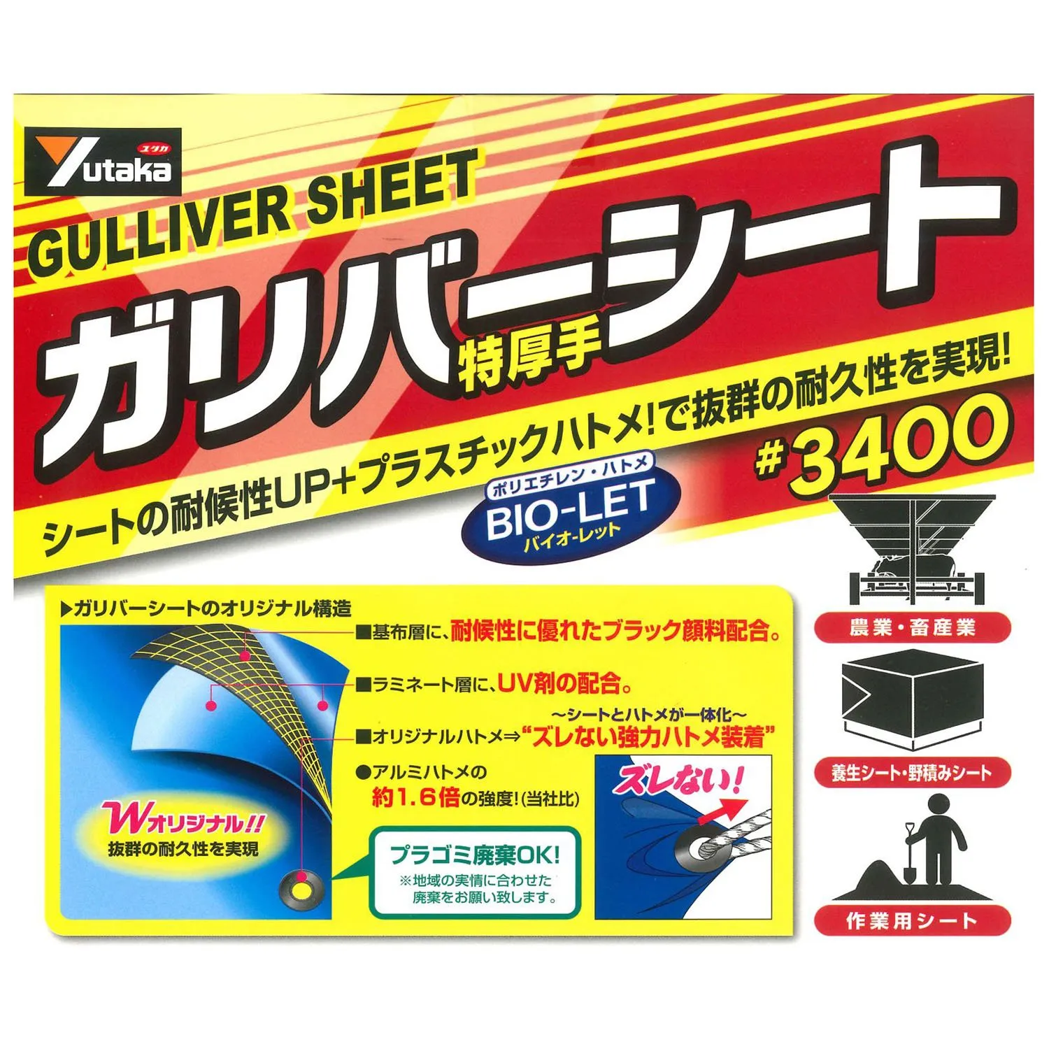 【特徴】 耐候性に優れたブラック顔料の基布と強カプラハトメ(バイオレット)を採用。 シートの耐候性アップとずれない強力ハトメで耐久性アップを実現。 廃棄時分別の必要がない。