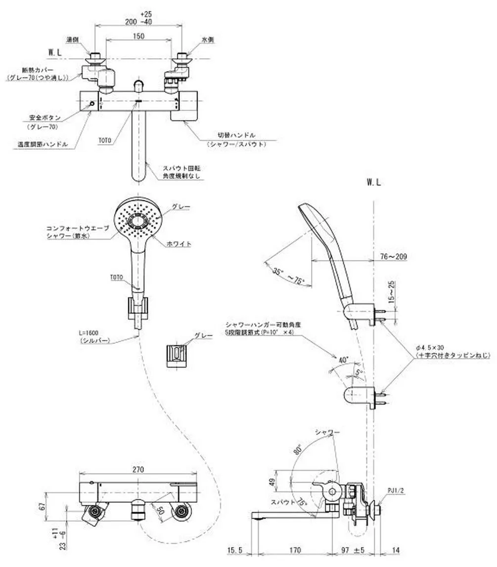 浴室用壁付サーモスタット混合栓 シャワー付き