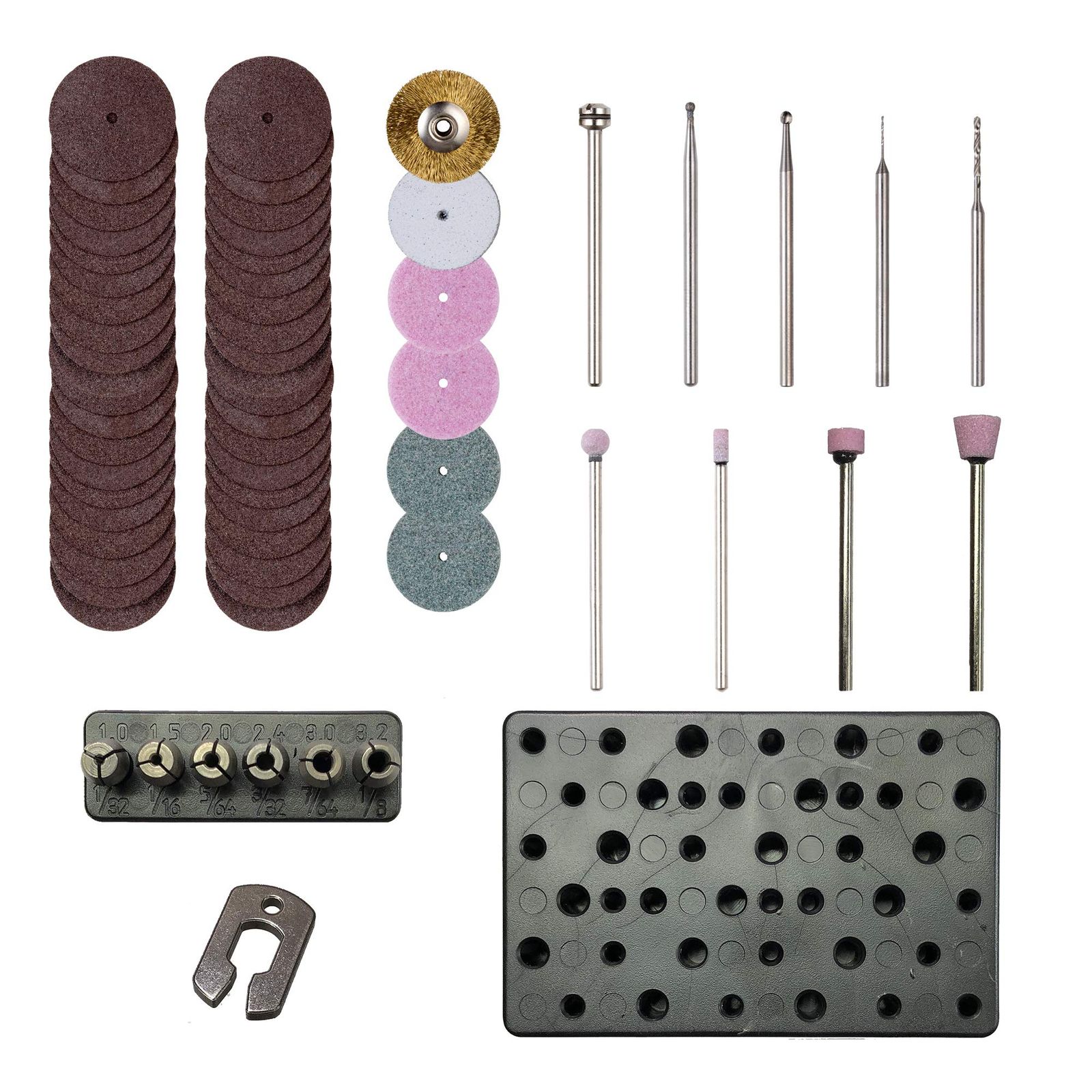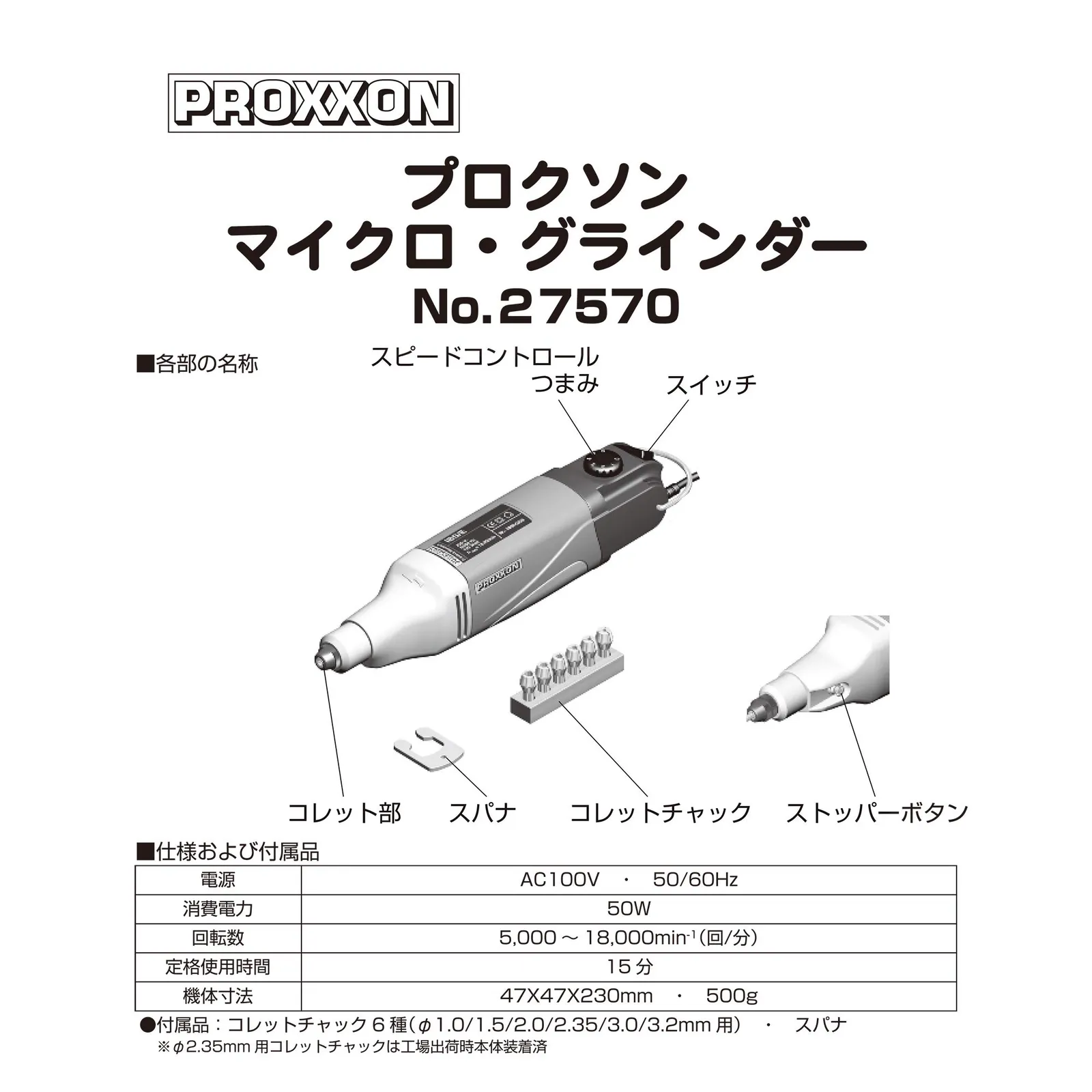 付属品:コレットチャック6種(直径1/1.5/2/2.35/3/3.2mm)・スパナ・ダイヤモンドビット1本・ハイスビット1本・軸付き砥石4種・ドリル2種・ディスク砥石WA2枚・ディスク砥石GC2枚・彫金バフ1枚・ワイヤーブラシ1枚・切断砥石20枚・専用シャフト1本・専用ビットスタンド