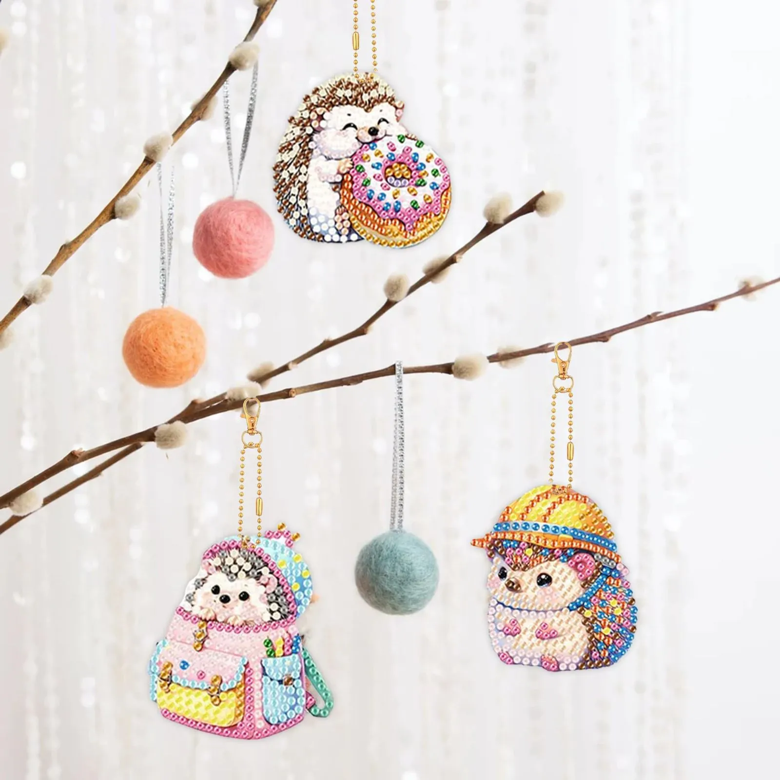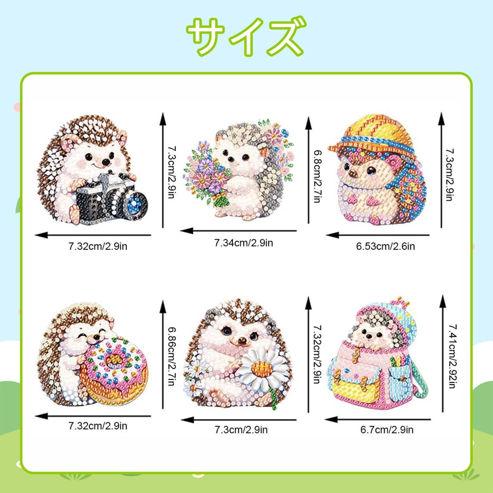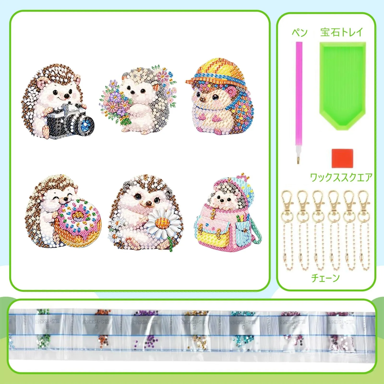 ビーズアート|小さいサイズで簡単完成・付属道具完備(トレイ・粘着泥・ダイヤモンド・チェーン)|キーホルダーとして使える・装飾用プレゼントに ハリネズミ かわいい ハリネズミ・両面DIY|初心者向け手作り 6個ダイヤモンドアート キーホルダーキット ダイヤモンド
