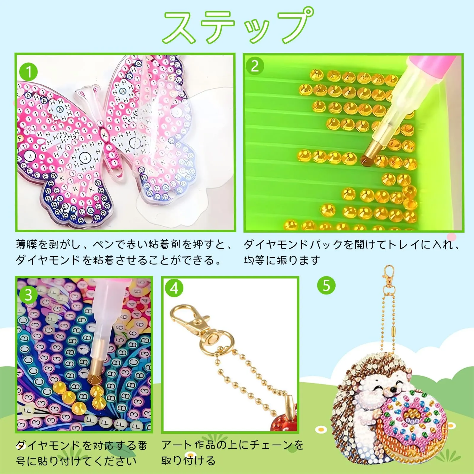 【初心者に優しいDIYキット】 1つのキーホルダーサイズ約3cmとコンパクト!短時間で完成するため、初めてのダイヤモンドアートでも達成感を味わえます。トレー・接着剤・ダイヤモンドビーズ・キーホルダー金具付きで即開始可能! 3.