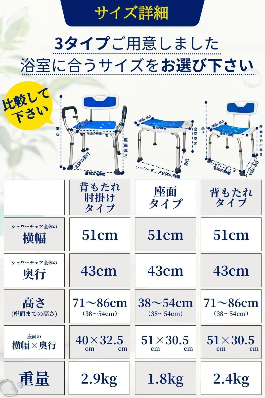 【選べる3タイプ】お風呂の大きさ用途に合わせて、お選びいただけるよう3タイプご用意しました。背もたれ肘掛けタイプ・座面タイプ・背もたれタイプ ?