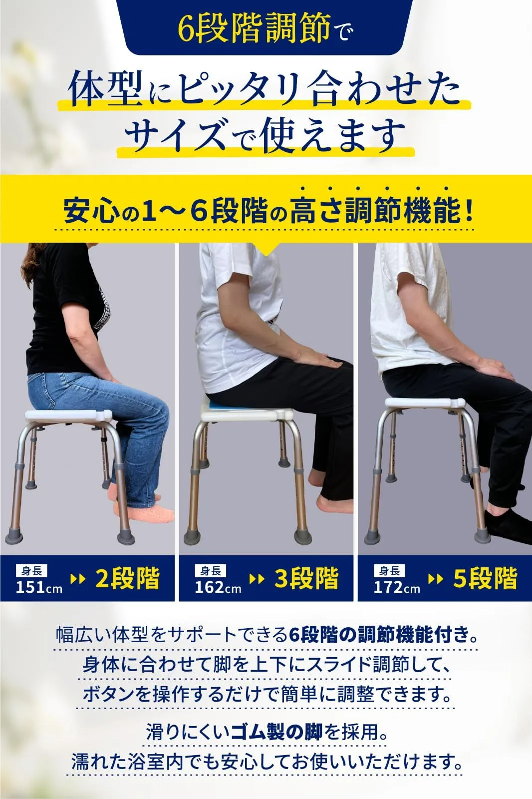 【転倒防止・安心お風呂ライフへ】高齢者が安心して入れるお風呂ライフへ。足先がゴム製ですので、転倒防止すべり止め効果抜群で安心して利用できます。座面の両側には手すりがあるので、浴室での転倒の危険からシャワーチェアがご家族を守ります。こんな商品お探しの方におすすめです。シャワーチェアー 浴室 椅子 風呂椅子 介護用 入浴介護 立ち上がり補助 転倒防止 ?