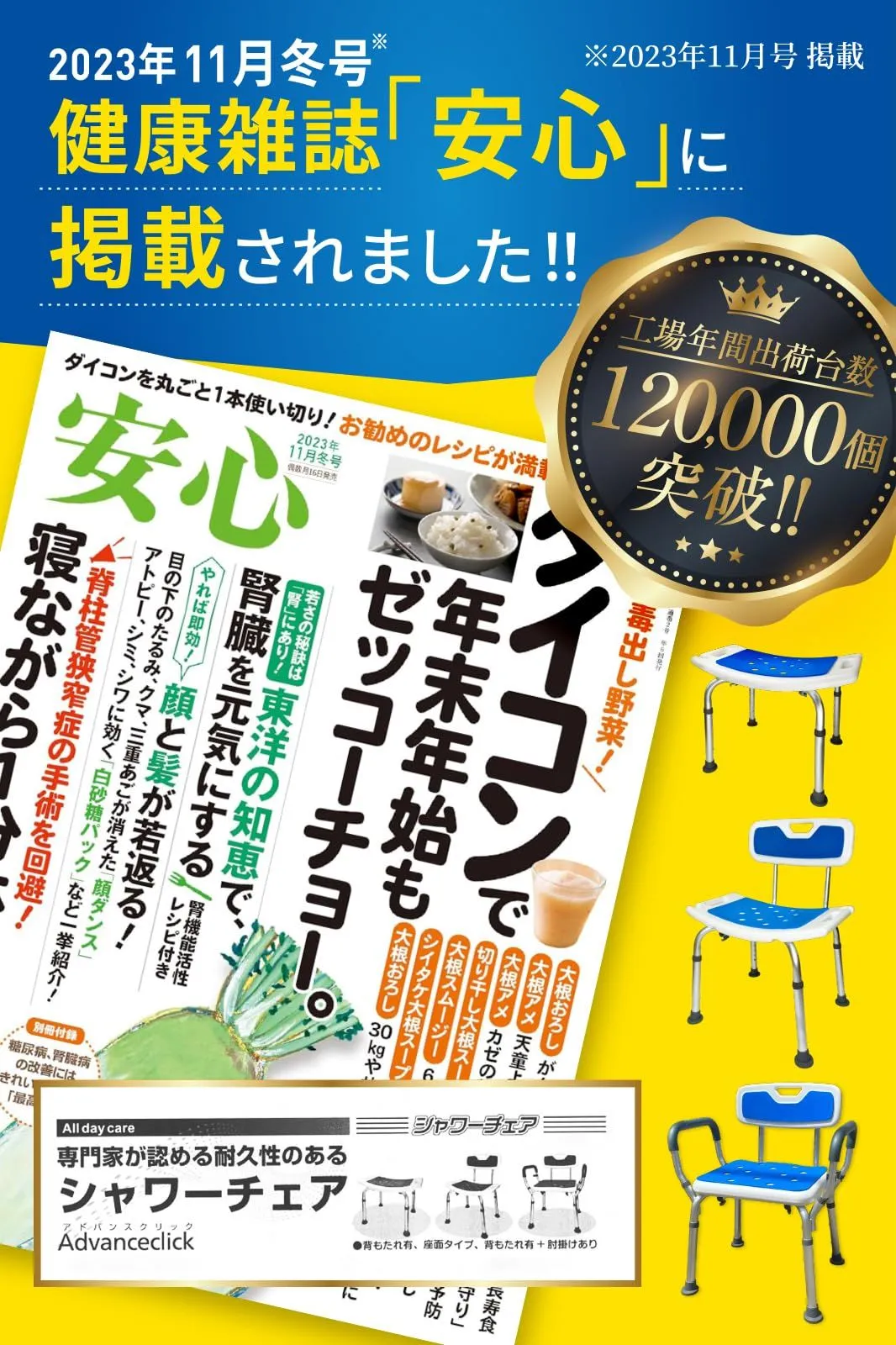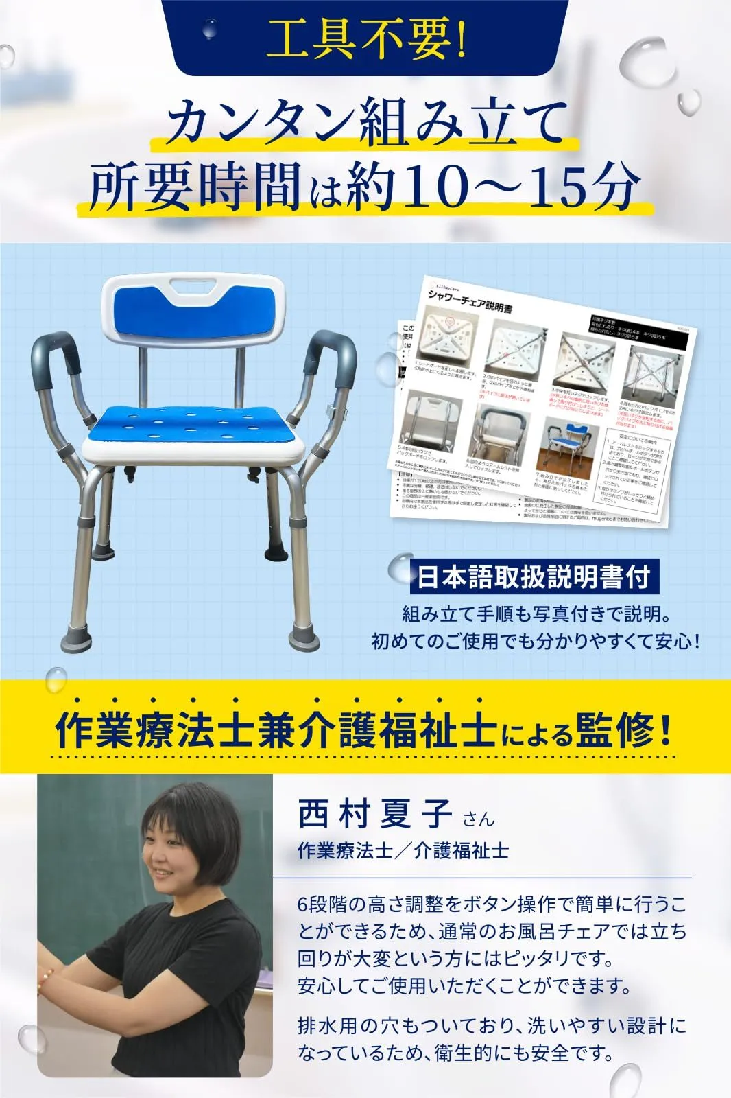 【健康雑誌掲載 】 本製品は、健康雑誌『2023年11月冬号』に掲載された注目のアイテム。 さらに、介護現場で活躍されている西村夏子さんのもと、介護現場のリアルな声をもとに開発されました。 西村さんは、多くの福祉施設で介護経験を積んできた**“現場のプロ”。その豊富な経験と専門的な視点を活かし、「使いやすさ」と「安全性」**に徹底的にこだわったシャワーチェアが完成しました。 ?