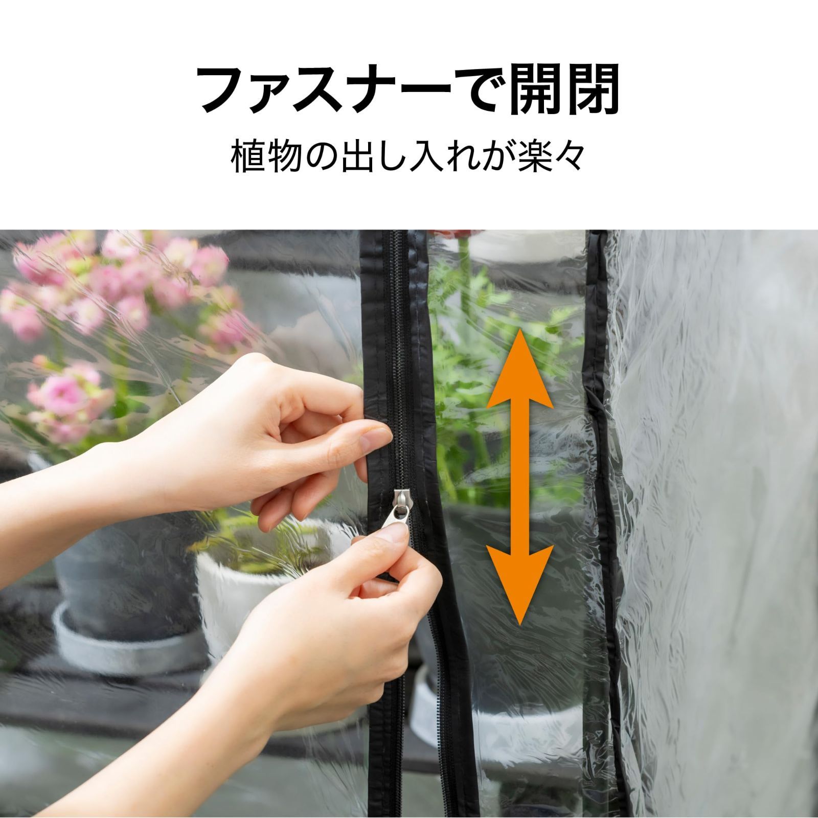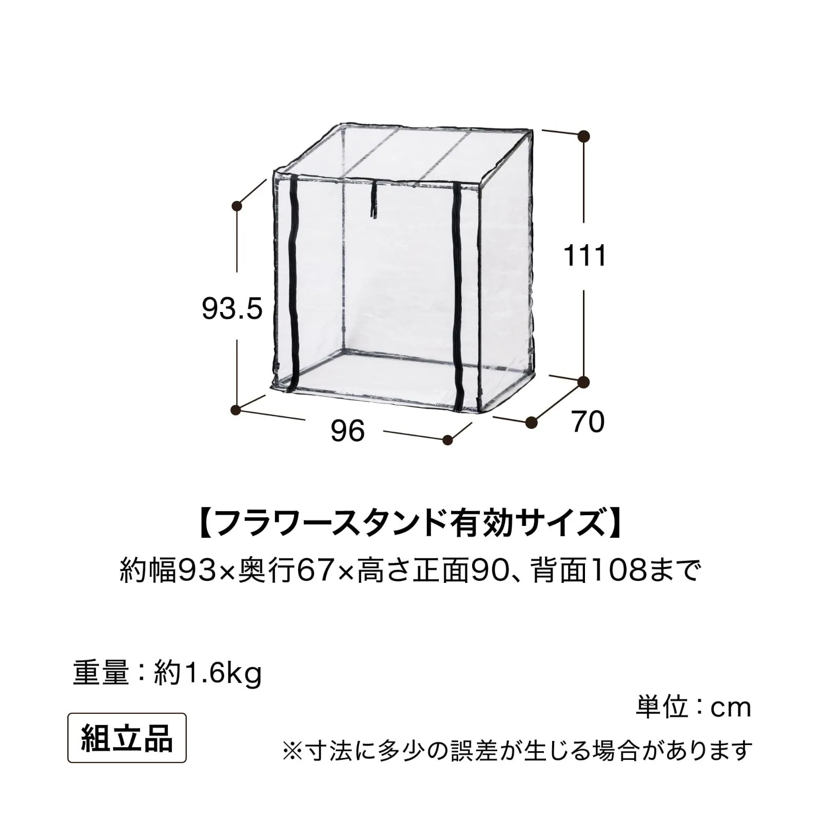 【スタンダードサイズ】 サイズは約幅96cm×奥行70cm×高さ111cm。お手持ちの**フラワースタンド(有効サイズ:約幅93cm×奥行67cmまで)**にかぶせて使用する簡易温室です。