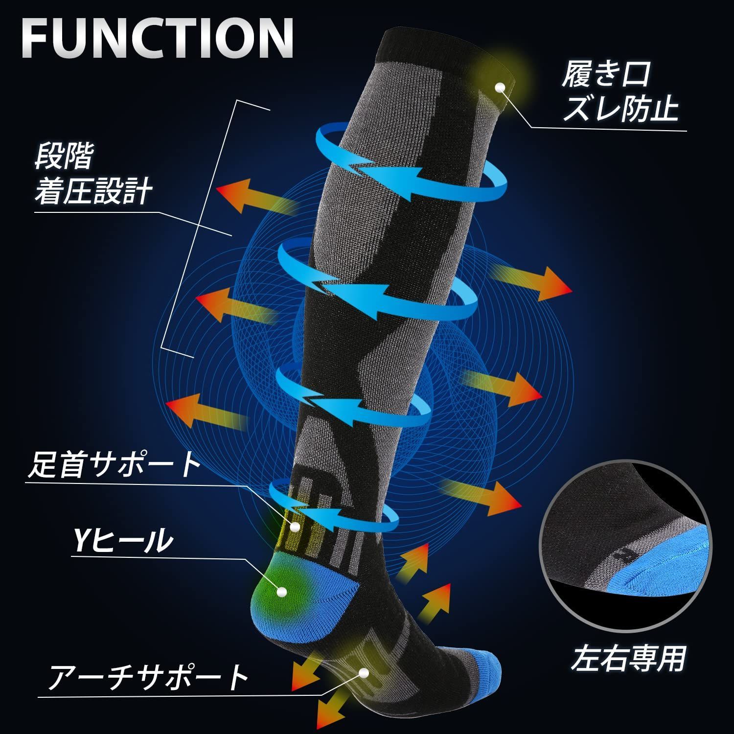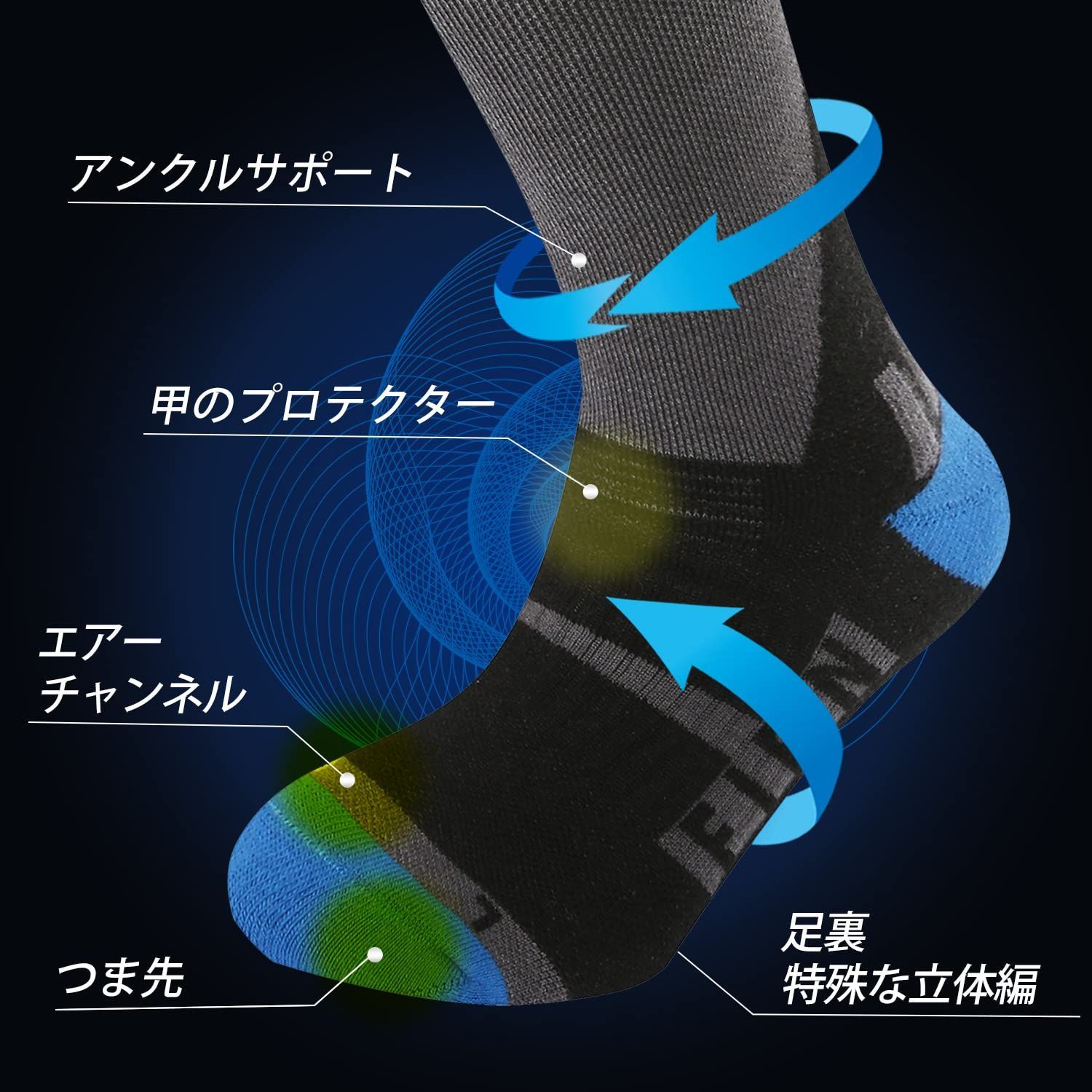 【疲労軽減をサポート】段階着圧設計、足首サポート、つま先・かかと補強、アーチサポート、足裏特殊な立体編、甲のプロテクター、エアーチェンネル、アンクルサポート。