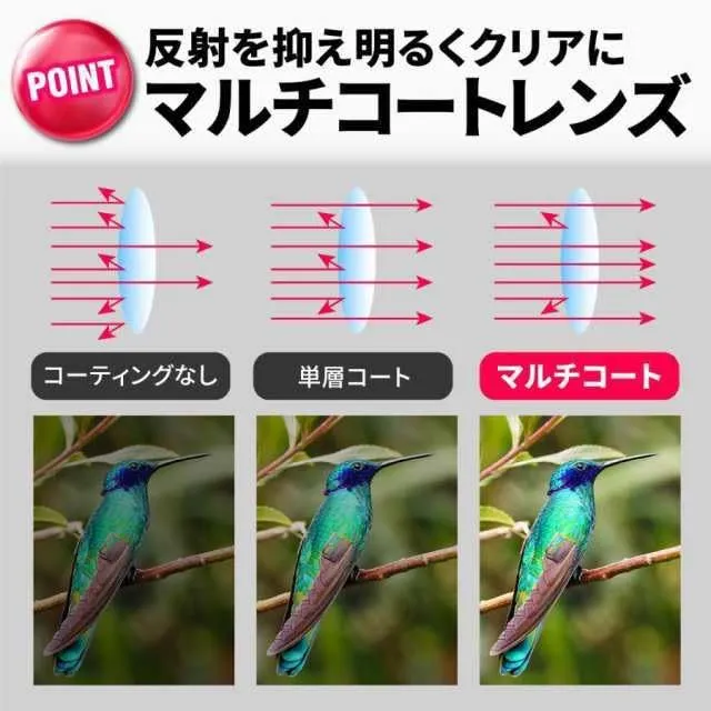 【計算された設計】 ・マルチコートレンズ採用 反射を抑え自然に明るく見えるレンズです。 ・生活防止使用 急な雨にも対応。野外フェスや自然観察、キャンプ、野外スポーツ観戦 野球観戦 サッカー観戦 アウトドア バードウォッチ などにも最適です。 ・アイレリーフ(レンズから目までの適切な距離)20mmのハイアイポイント仕様 レンズと目の距離が離れていても綺麗に見え、メガネをかけたままで使用可能です。