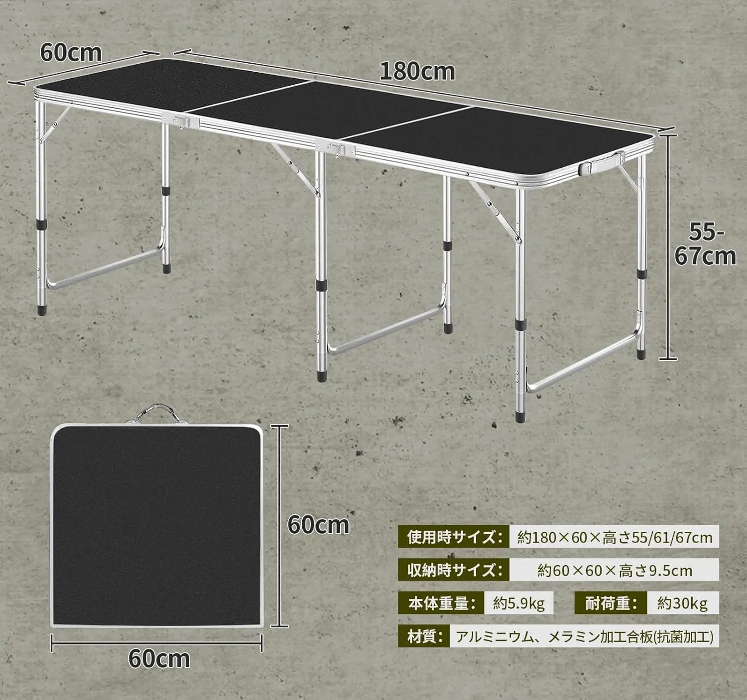 【サイズ】 :使用時/約180×60×高さ55/62/67cm、収納時/約60×60×高さ9.5cm 。本体重量 : 5.9kg、耐荷重:約30kg。 ?