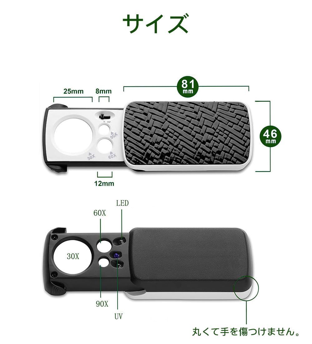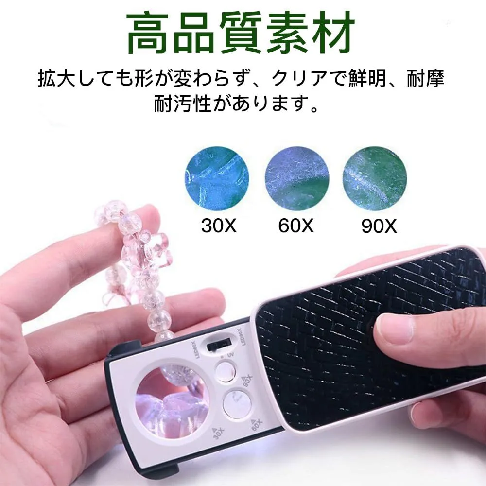 ブラック 精密作業用 校正 ジュエリー鑑定 軽くて持ちやすい ブラックライト付き LEDライト 3種類レンズ 拡大鏡 携帯ルーペ 倍率30倍/60倍/90倍 ジュエリールーペ LOYELEY