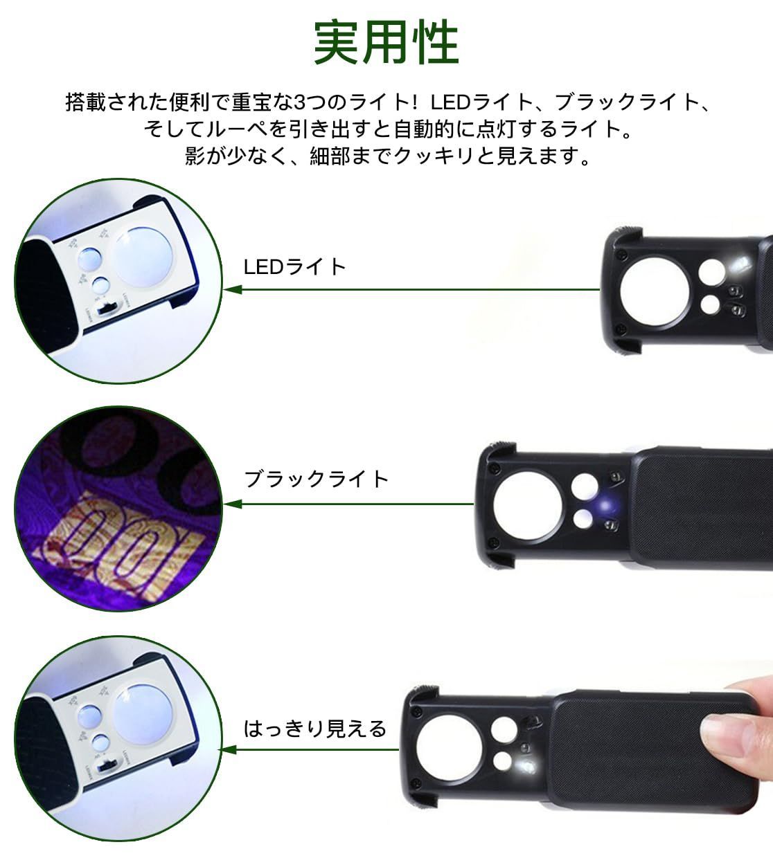 【精密作業に大活躍】さまざまな精密作業や日常生活、動植物の観察に役立ちます。ジュエリーの鑑定、印刷物の読み、校正、校閲など対応できます。ブラックライトを使用すると、紙幣や骨董品の鑑定、外食業や調理器具、食器などの脱脂洗浄の確認、蛍光灯を使用した水漏れチェックなどが可能です。 ジュエリールーペ 最後までご確認頂き誠にありがとうございました。 上記をご確認頂き、ご購入いただけましたら幸いです。 何かご不明な点がございましたらお気軽にメッセージからお問い合わせ下さい。