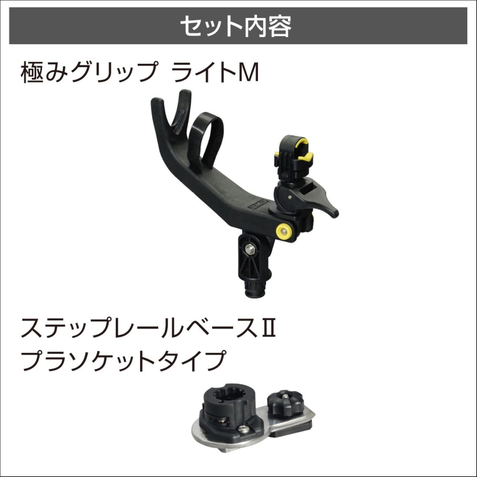 極みグリップに樹脂製のライトタイプが登場! ライトな釣りにご使用いただけます。ホルダー部からワンタッチで竿を取り外すことができ、シャクリにも対応しています。すでにステップレールが取り付けてある場合にすぐにご使用いただけるようステップレールベースがセットになっています。ベースを取付する際のノブネジが樹脂製になったので、取付時の締め込みが工具不要で簡単にできます。※ロッドの落下を防ぐために必ず尻手ロープをご使用ください。