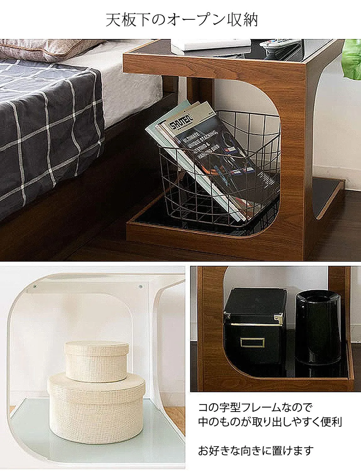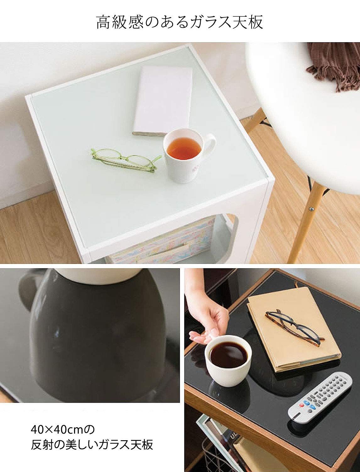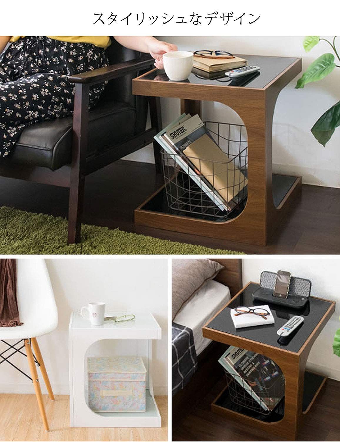 ソファやベッドサイドでちょっとした物を置くのに最適。天板の下はガラス板のおしゃれなオープンスペース。高さのあるものも収納できる