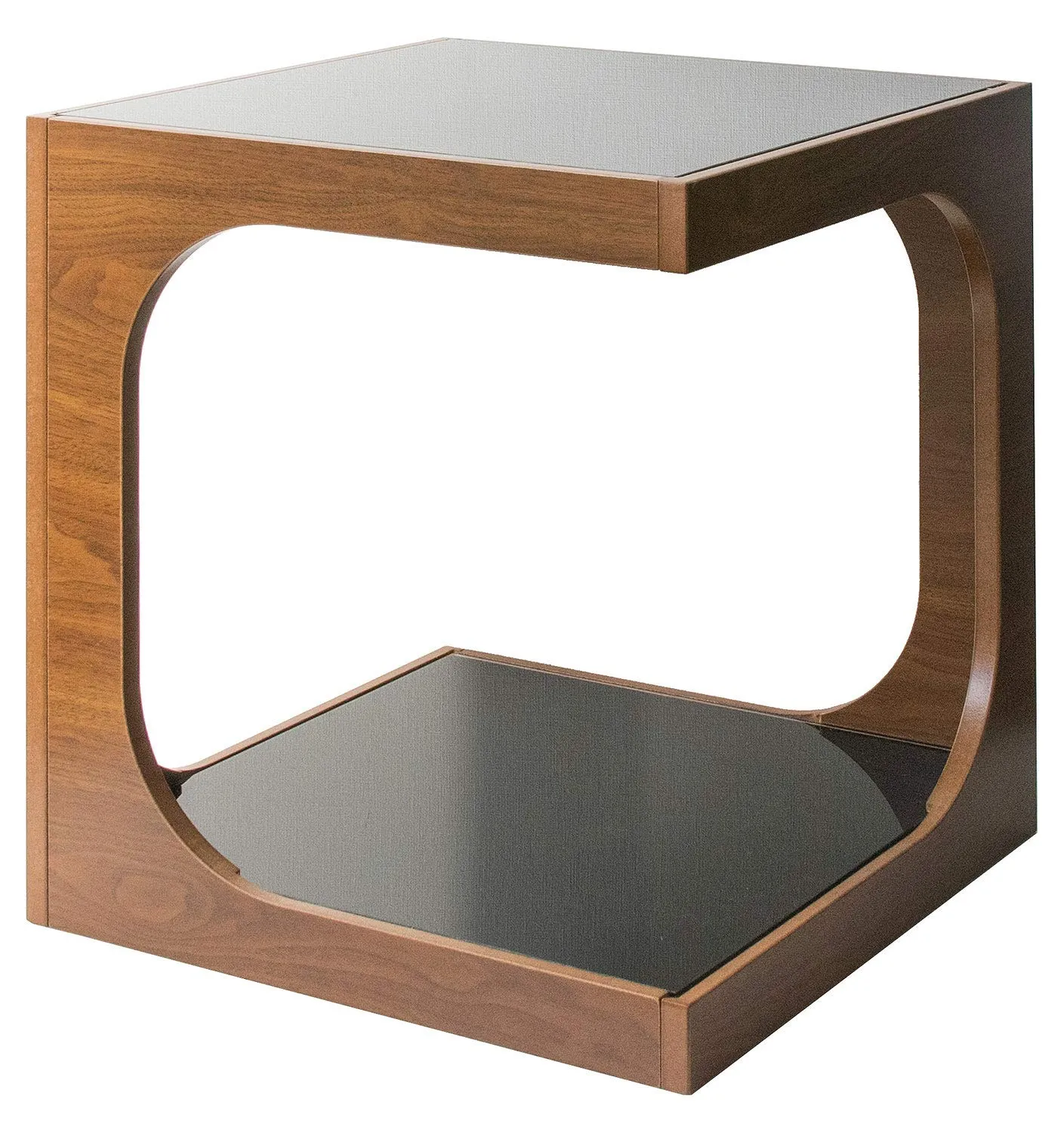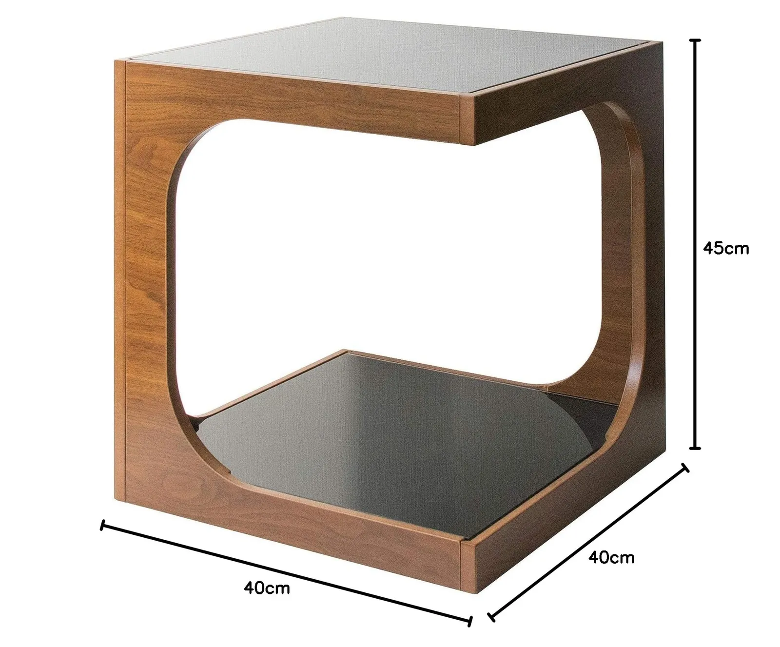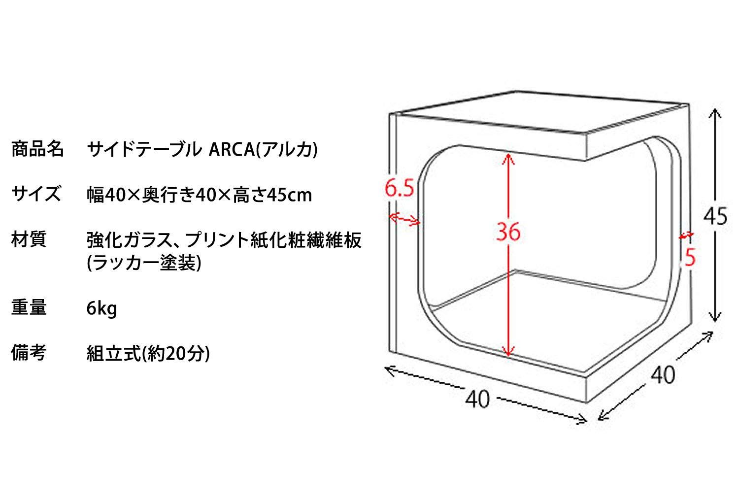四角いキューブ型をくり抜いたようなスタイリッシュなガラス天板と木製フレームのサイドテーブル『ARCA(アルカ)』。