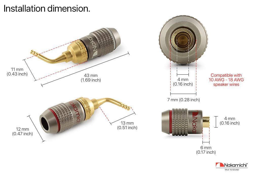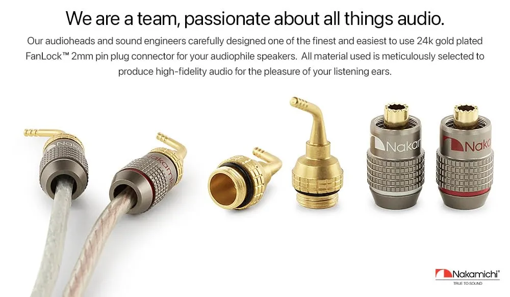 ? Nakamichi FanLock 2mm ピンプラグは、オーディオコンポーネントのスプリングクリップコネクタに直接シームレスにフィットし、スプリングクリップへの繰り返しの挿入と取り外しによるスピーカーワイヤ端の損傷を防ぎ、接触不良や断続的な信号の問題のリスクを軽減します。