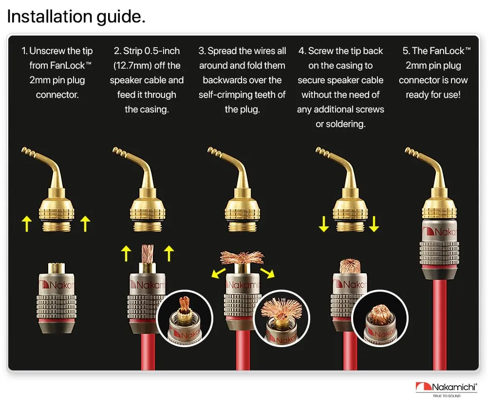 ? FanLockデザインにより、2mm ピンプラグはスピーカーケーブルにしっかりと接続されたままになります。取り付けはネジを使用せず数秒で完了し、スリーブが非導電性であることを知って安心できます。