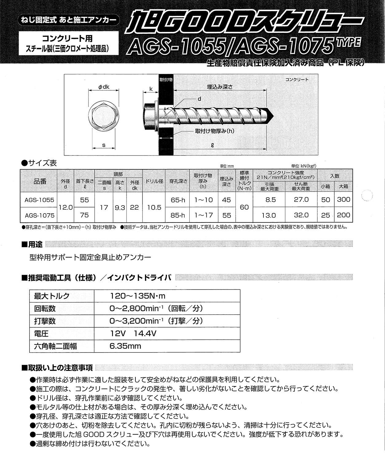 【注意事項】 ※一度使用した旭グッドスクリューおよび下穴は、再使用しないで下さい。 ※下穴穿孔には、必ず指定のアンカードリル(ADX-10.5SDS)をご使用ください。 ※過剰な締付けは行わないでください。 ※(インパクトレンチのご使用は過剰締付の原因となります。 ※)。 ※施工の際は、コンクリートにクラックの発生や、著しい劣化が無いことを確認してから行ってください。 ※モルタル等の仕上材がある場合は、その厚み分深く埋め込んでください。 最後まで確認ありがとうございました。 注意点 ・配送会社の指定はできかねます。 ・営業所止めは受けておりません ・ご注文後のお問い合わせはメッセージよりお願い申し上げます。