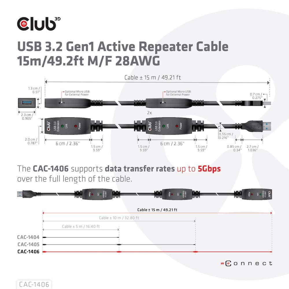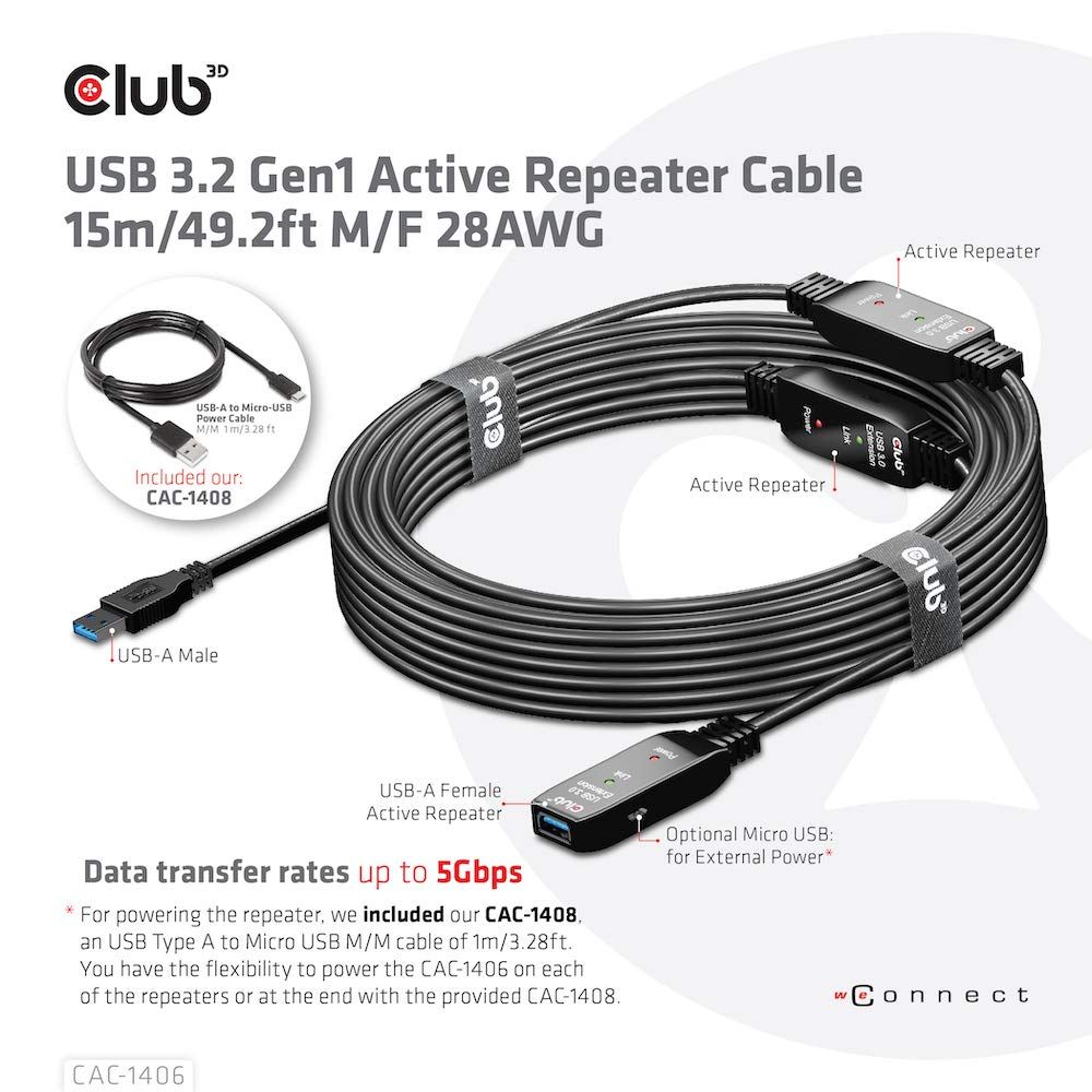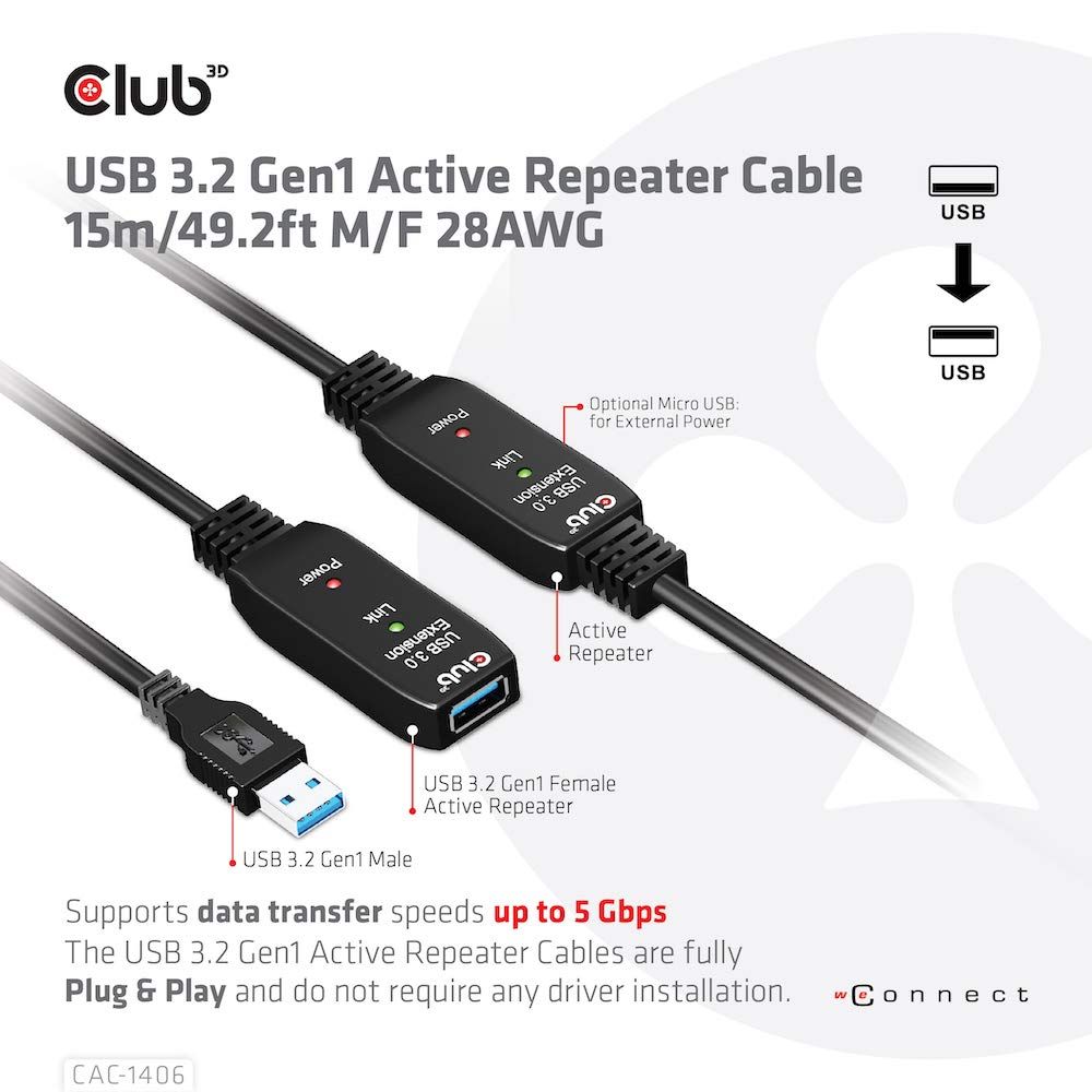 新品 Club 3D USB 3.2 Gen1 5Gbps アクティブ リピーター ケーブル 15m オス/メス 28AWG (CAC-1406)