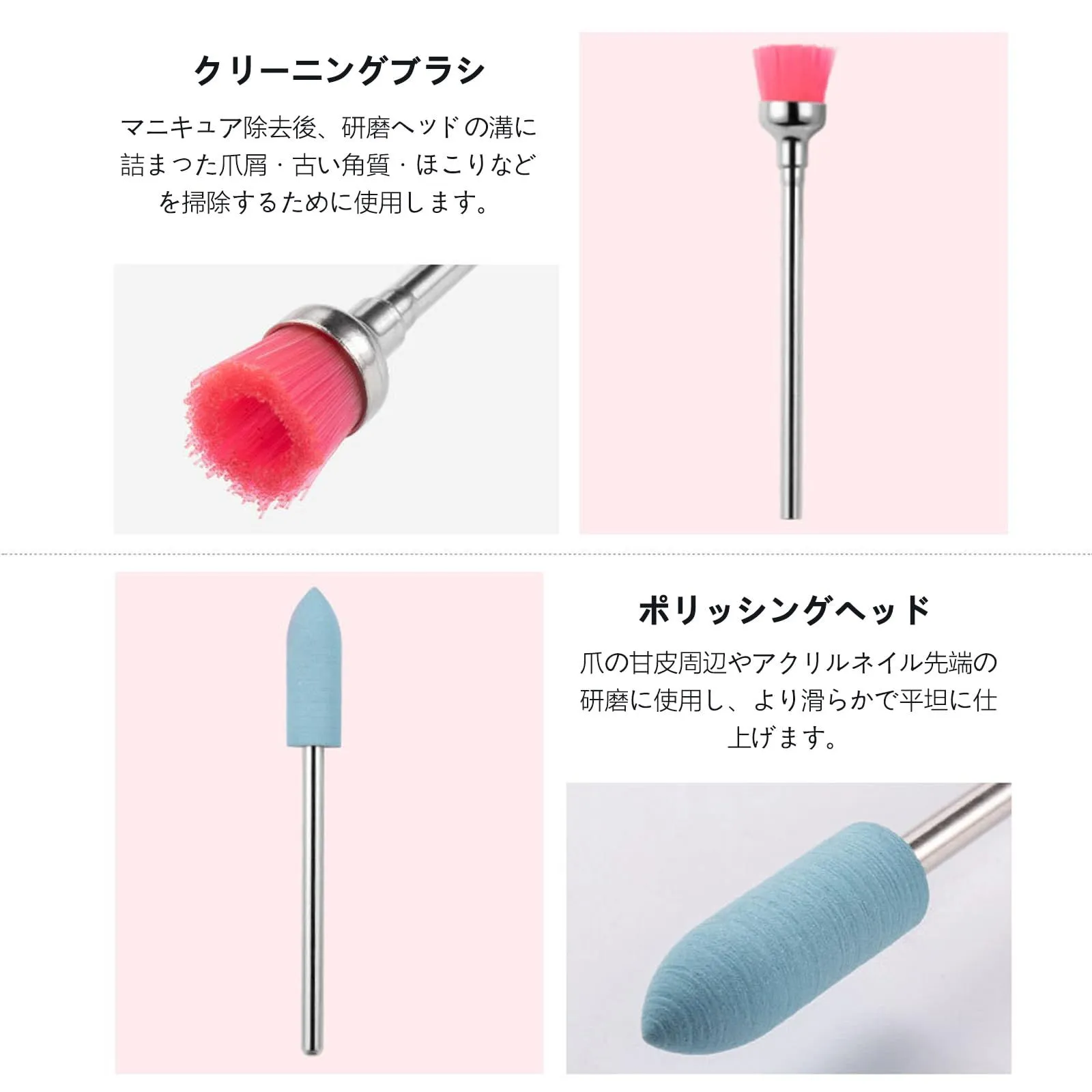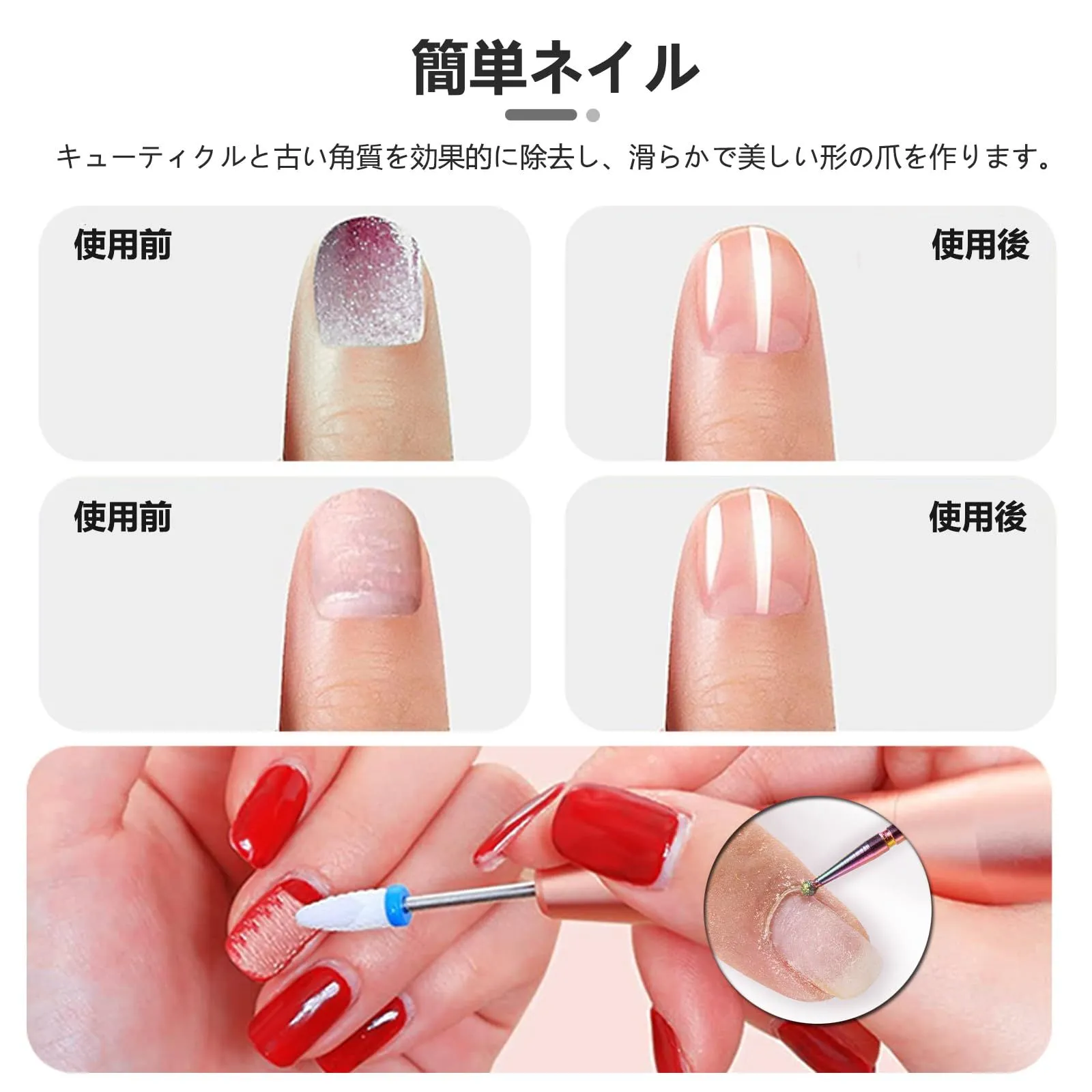 適用性:ネイルサロン、ネイルアートスクール/カレッジ、ネイルアートアーティスト、自宅や個人的な使用などに適しています。キューティクルと古い角質を効果的に除去し、滑らかで美しい形の爪を作ります。初心者でも簡単に使用できるネイルビットです!