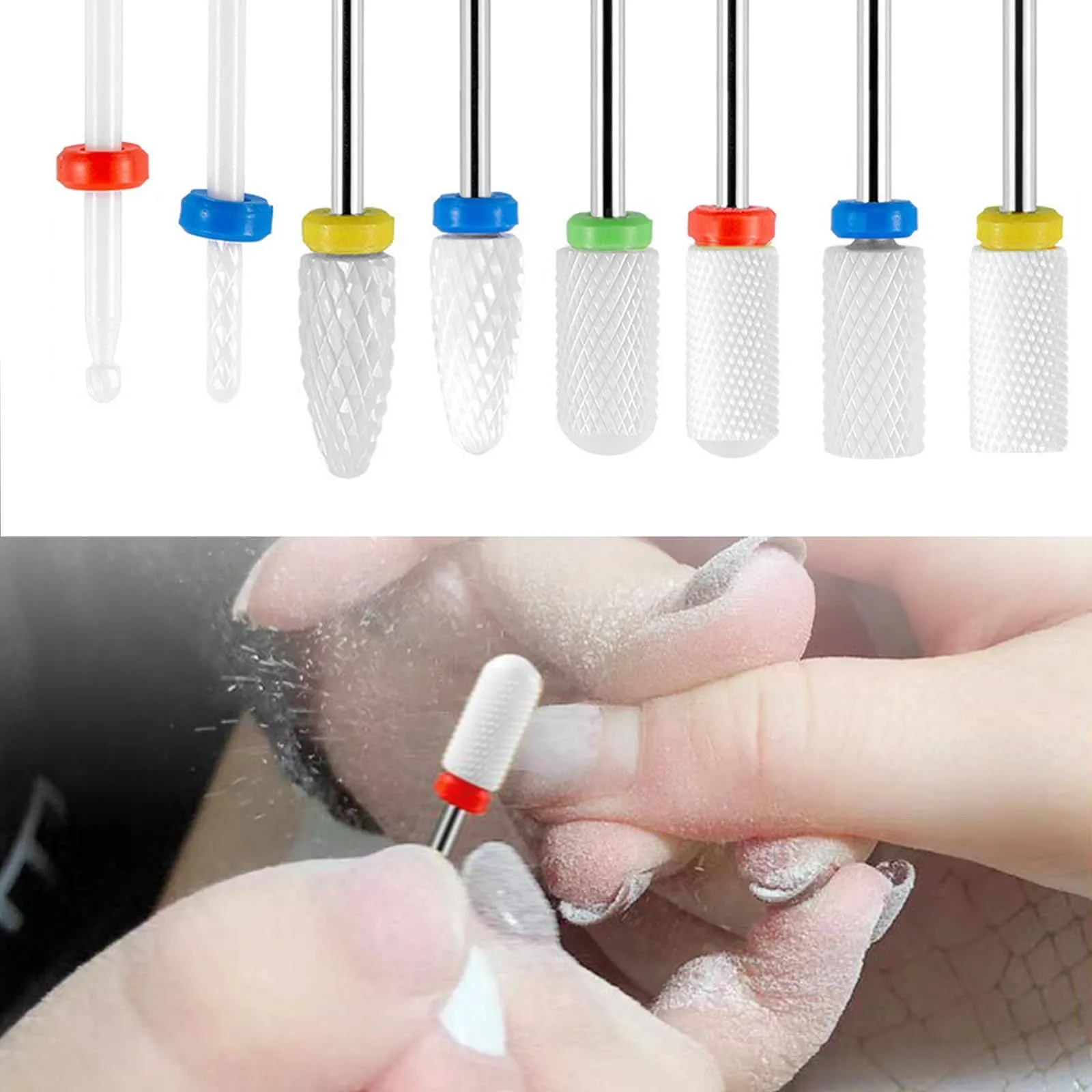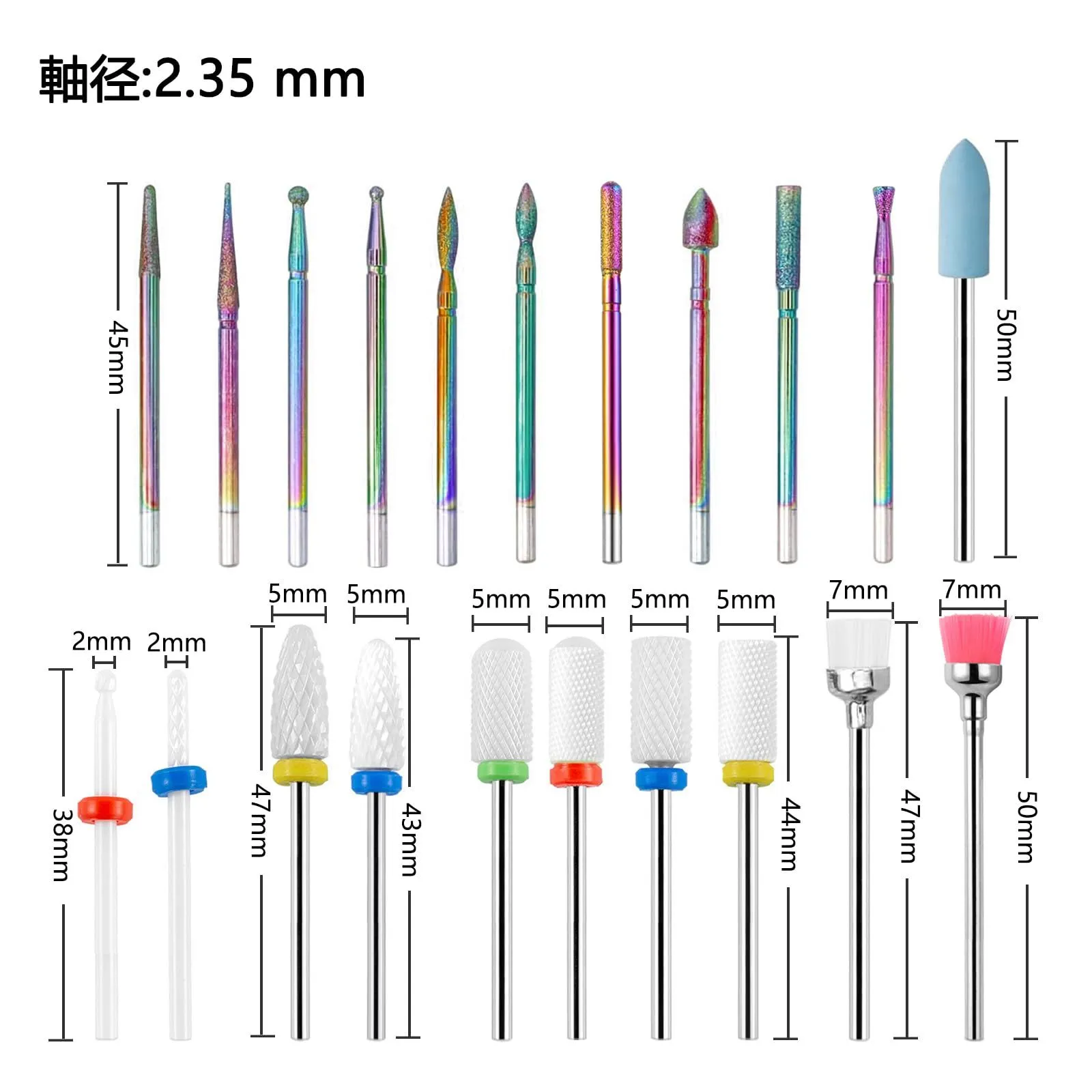 機能:頭部に異なる形状のネイルドリルビットセットがあり、さまざまなネイルニーズに対応できます。2.35 mm軸径は、ほとんどのプロの電動ネイルマシンツールに適しています。