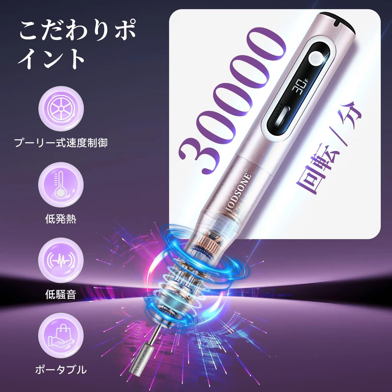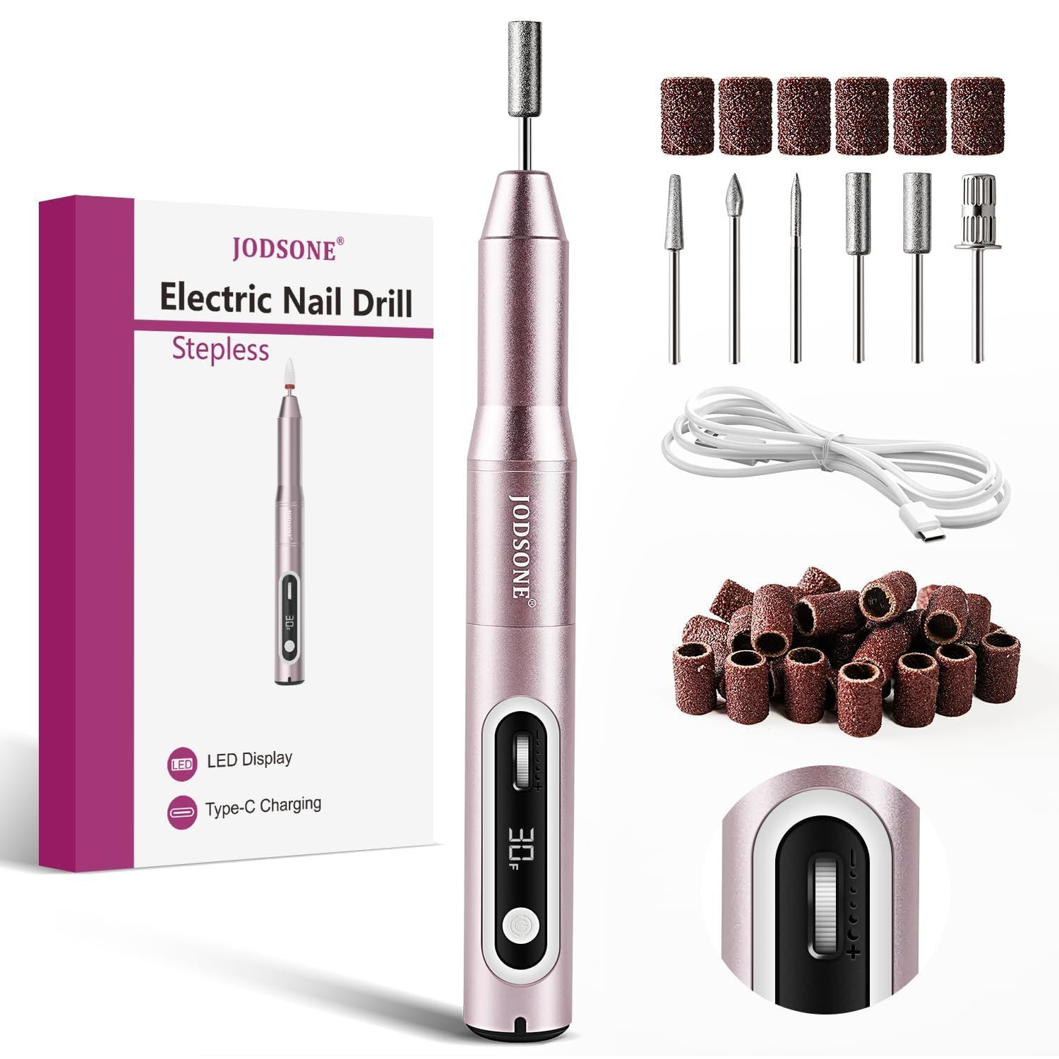 JODSONE プロフェッショナルネイルドリル 30000回転/分 低騒音 スピードコントロールスライドボタン付き 交換用ドリルビット6本付属 ホームサロン用マニキュア・ペディキュアツール