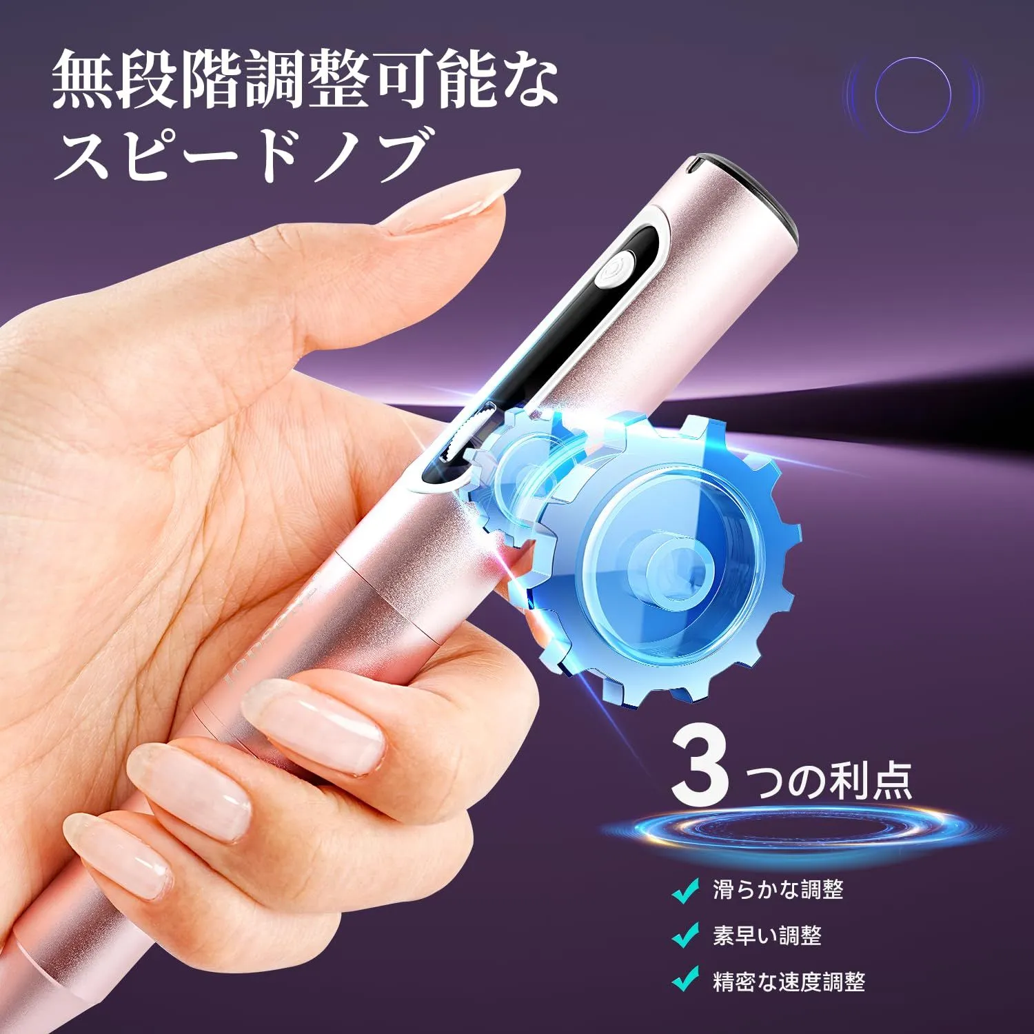 速度・回転方向調節機能:回転式速度調節ボタンを搭載し、最大30,000回転/分まで調整可能。最適な速度を簡単に選択できます。動作中はダブルクリックスイッチで正逆回転を切り替え可能。左右どちらの手でも操作できます。