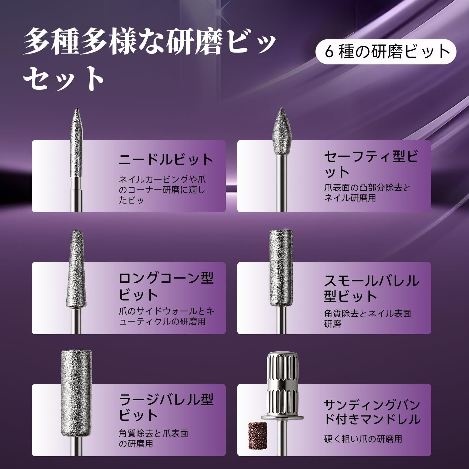 プロフェッショナルネイルドリル 30000回転/分 低騒音 スピードコントロールスライドボタン付き 交換用ドリルビット6本付属 ホームサロン用マニキュア・ペディキュアツール