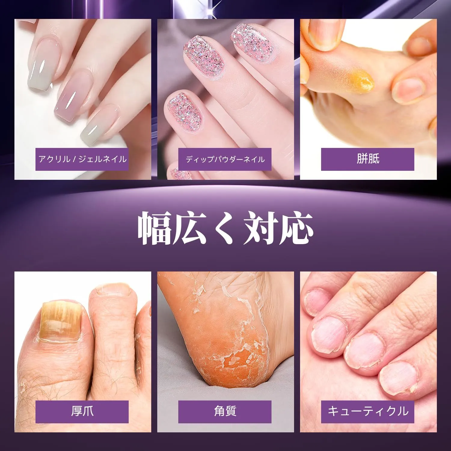 高効率ネイルドリル:各種研磨ヘッドとサンディングディスクを装備し、低騒音かつ安定した性能で動作します。回転数を表示するLEDディスプレイを搭載しており、日常的なネイルケアに最適です。