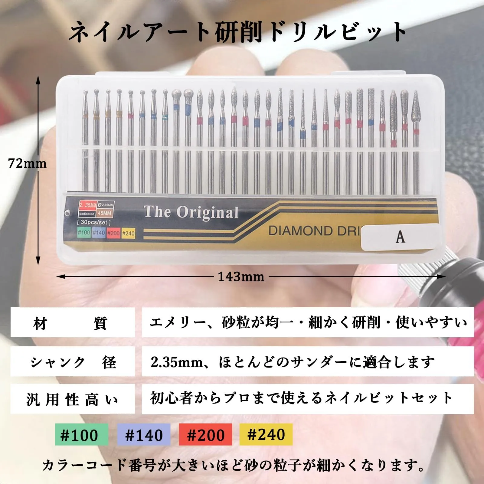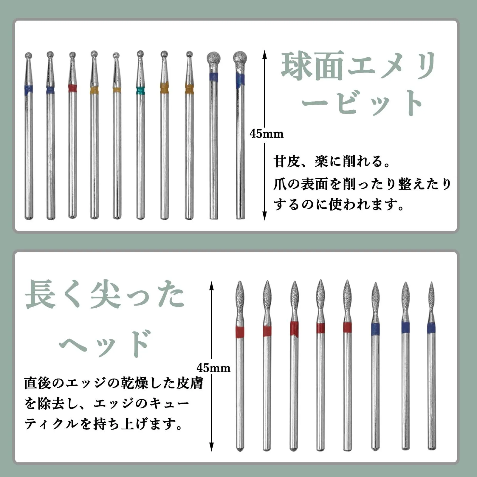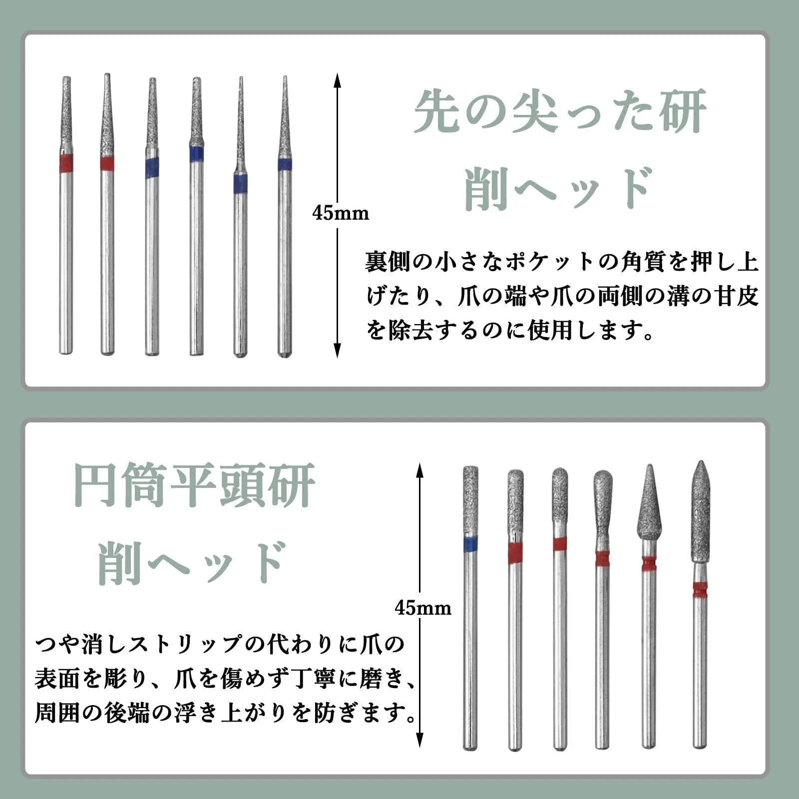 ダイヤモンド粒子が付いたビットは、硬い素材を効果的に削ることができます。主に爪の表面を滑らかにするために使用されます。