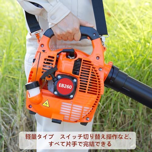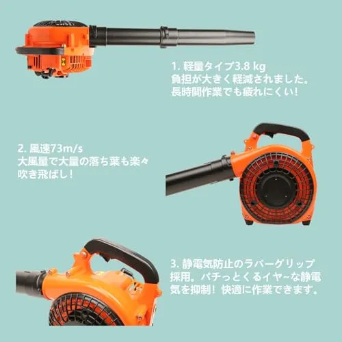 エンジン 25.4cc 2サイクル;起動方法 リコイルスタータ式;アイドル回転数:26003000rpm;風速:72m/秒;商品重量:約3.85kg;燃料タンク容量:約0.45L。日本語取扱説明書付き。