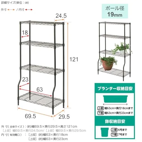 ドウシシャ ルミナス ガーデンラック 幅70 4段 屋外OK サビにくい スリムスチールラック 可変棚 プランターラック フラワースタンド 園芸 観葉植物 全体耐荷重320kg 幅69.5×奥行29.5×高さ121cm ポール径19mm GR7012BD-★m