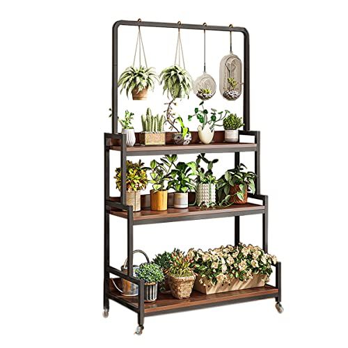 RAKU プランターラック フラワースタンド 3段 ストパー付きキャスター 幅83.5×奥行き38.5×高さ165.5cm 植木鉢ラック 吊り鉢 吊り下げ ウォールナット 園芸ラック 花置き棚 アイアン ホワイト ブラック (黒)★m