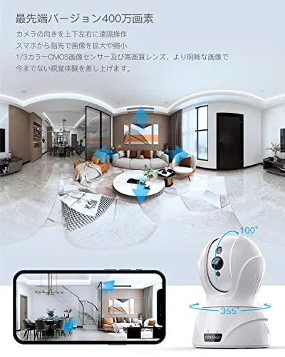 「400万高画質・広範囲遠隔監視」 cooau 400万画素ネットワークカメラは1/3" CMOSセンサーと3.6mmレンズを搭載し、更に2Kの解像度に2602*1472Pがあり、遠隔まで映像から細かい部分まで撮影が可能なフルハイビジョンの超高画質になります。134度超広角レンズ及び水平350度・垂直100度回転機能を持って、死角がなく広範囲で細かく監視することができます。また高画質により8倍デジタルズームレンズを搭載され、自由に画面/映像を拡大、縮小、転向でき、安心で出掛け、通勤、出張することができます。注.本社の400万画素、500万画素、600万画素の室内用カメラは同じ外形と機能で、画素が異なるだけです。