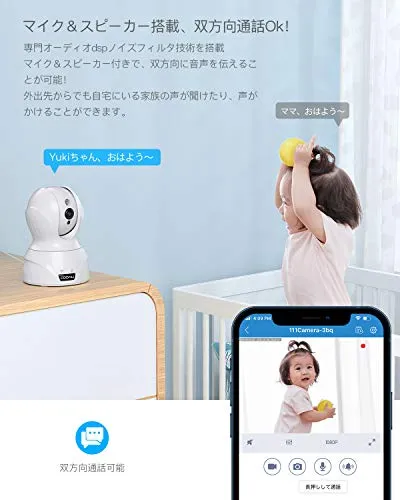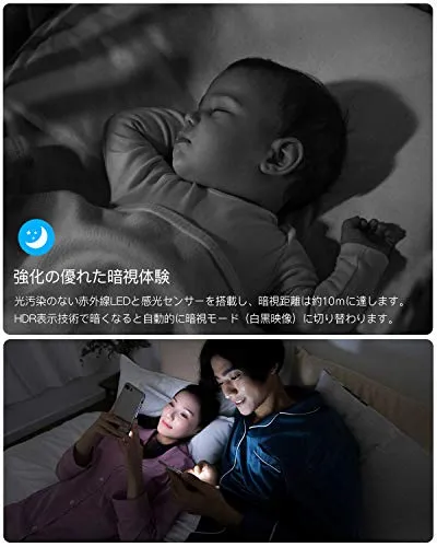 「5Gwifi対応・双方向通話・暗視撮影」 最新のチップを採用し、2.4Gwifiだけでなく5Gwifiにも対応しています。ネットワーク接続がスムーズで、携帯電話やパソコン、電子レンジなどの電子機器との干渉も受けにくく、ネットワーク接続の問題を90%も解決しています。他メーカーの製品より四倍通信範囲を強化しています。カメラの周囲の音声を360度拾うことができる集音マイク&スピーカーを内蔵し、ノイズフィルタ技術を搭載され、遠隔地の海外でもスマホで子供やペットや老人に話しかけることができます。スマ一トIR-CUT技術により、昼と夜の明るさに反応して自動切り替え可能です。波長850nm赤外線LEDを内蔵、通常のカメラに比べてセンサ効果が3倍に向上し、暗視距離は約12mに達し、真っ暗な中でも鮮明に映像を映し出します。子供たちが寝っている状態を見えることはとても幸せです。プレゼントとして家族や友