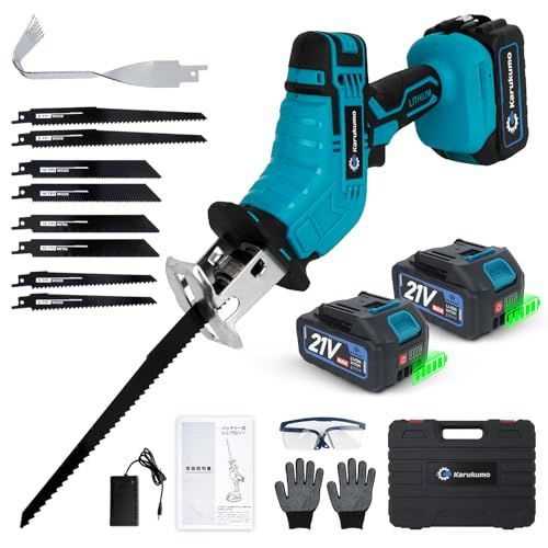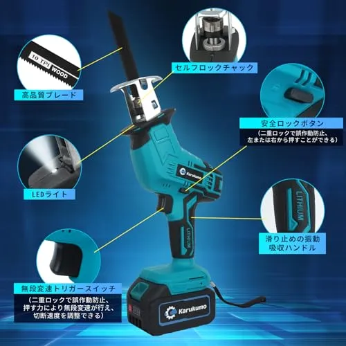 【新型除草ブレード対応】Karukumo レシプロソー 電動ノコギリ 大容量バッテリー2個付き 替刃9本 片手操作 充電式 セーバーソー コードレス 電気のこぎり 無段階変速 雑草取り 草抜き 根こそぎ 枝切り 木材 金属 園芸DIY用 電動カッター 収納★m