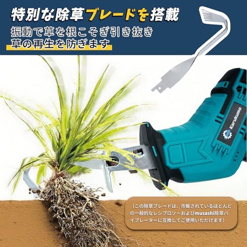【新型除草ブレード搭載・ブレード9本付】本Karukumo製品は通常のレシプロソー機能に加え、庭や畑で悩まされる雑草の根こそぎ除去を実現する「新型除草ブレード」を搭載しています(この除草ブレードは、市販されているほとんどの一般的なレシプロソーおよびmusashi除草バイブレーターに互換してご使用いただけます)。振動によって雑草を根から引き抜き、従来の草刈り機のように地上部分だけを刈るのではなく、再生を抑制する効果が期待できます。木工用6TPI 200mmブレード2、木工用6TPI 150mmブレード2、木工用10TPI 150mmブレード2、金属用18TPI 150mmブレード2、除草ブレード1、計9本の替え刃がセットに含まれています。除草作業と切断作業を一台でこなせる万能ツールです。