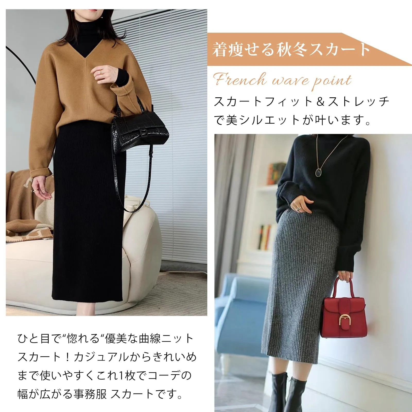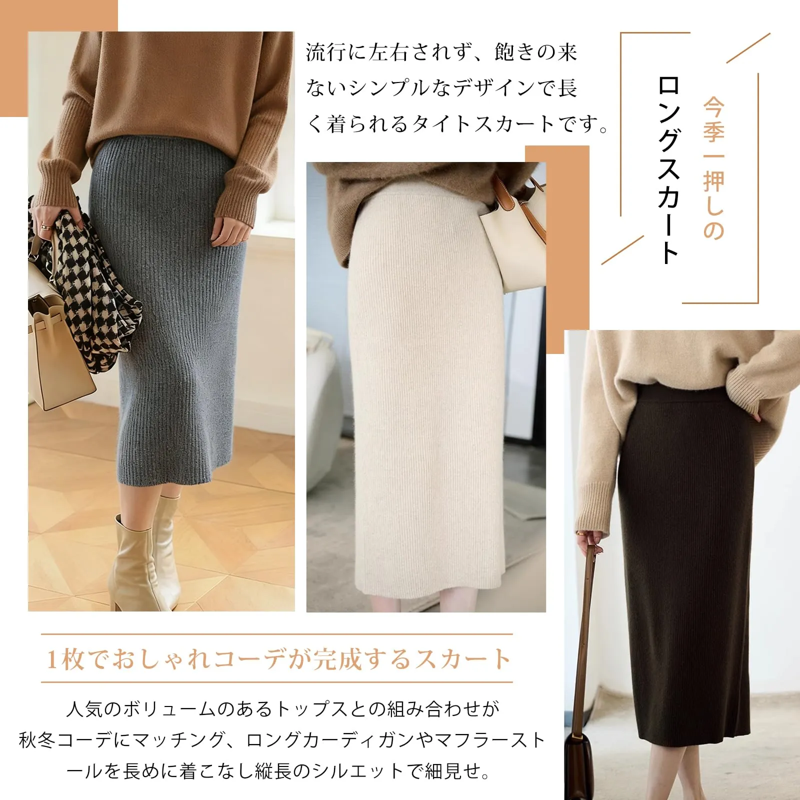 【リブニットタイトスカート】寒い日の相棒!着痩せるリブニットタイトスカート。美しいラインをメイクするタイトシルエットは身体に程よく沿うサイズ感と縦リブの相乗効果でスリム見え。流行りに左右されないシンプルさでお出掛けにもお仕事にも使える頼もしいアイテム。やみつきになるフィット感がスレンダー見えを叶える秋冬 スカート。
