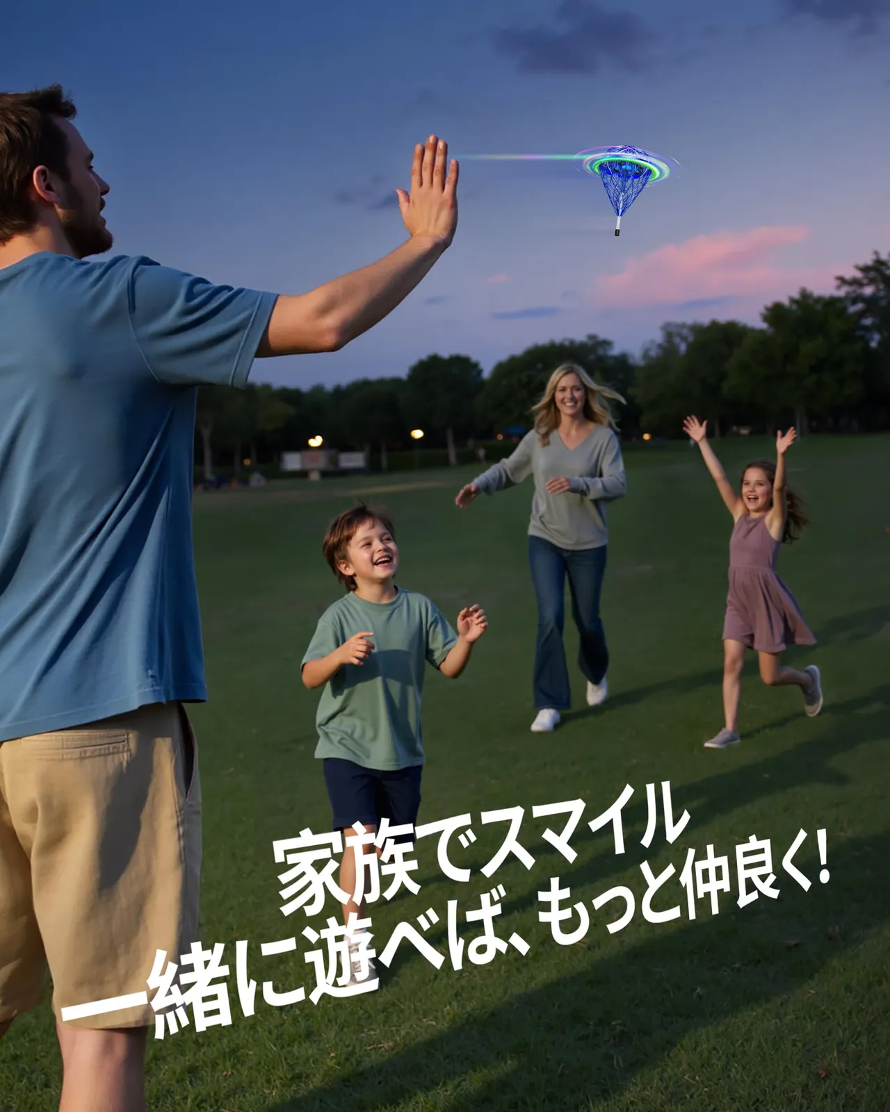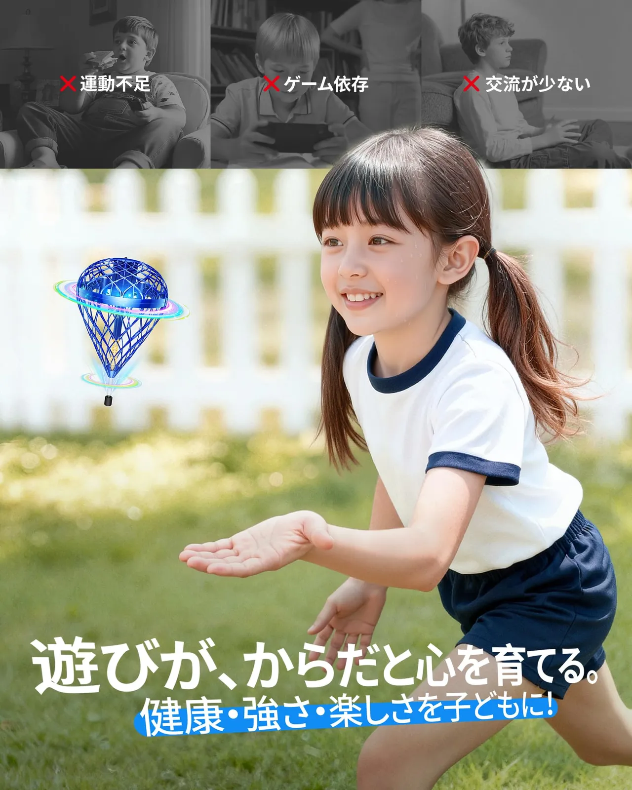 【1球で何通りも遊べる!】遊び方はとても簡単。フライングボールProを軽く投げるだけで、ふわっと空中に浮かぶ「フロートモード」に!手のひらで前に押し出せば、家族や友達と楽しめる「キャッチ&パス」モードに切り替わります。さらに、手・足・体のどの部分でも底部のスプリングにタッチすると、「バウンドプレイ」でテンポよく跳ね続けます。コツをつかんで素早くタップすれば、驚きの3Dフリップ回転が発動!楽しめる設計で、親子のコミュニケーションや運動遊びにもぴったり。