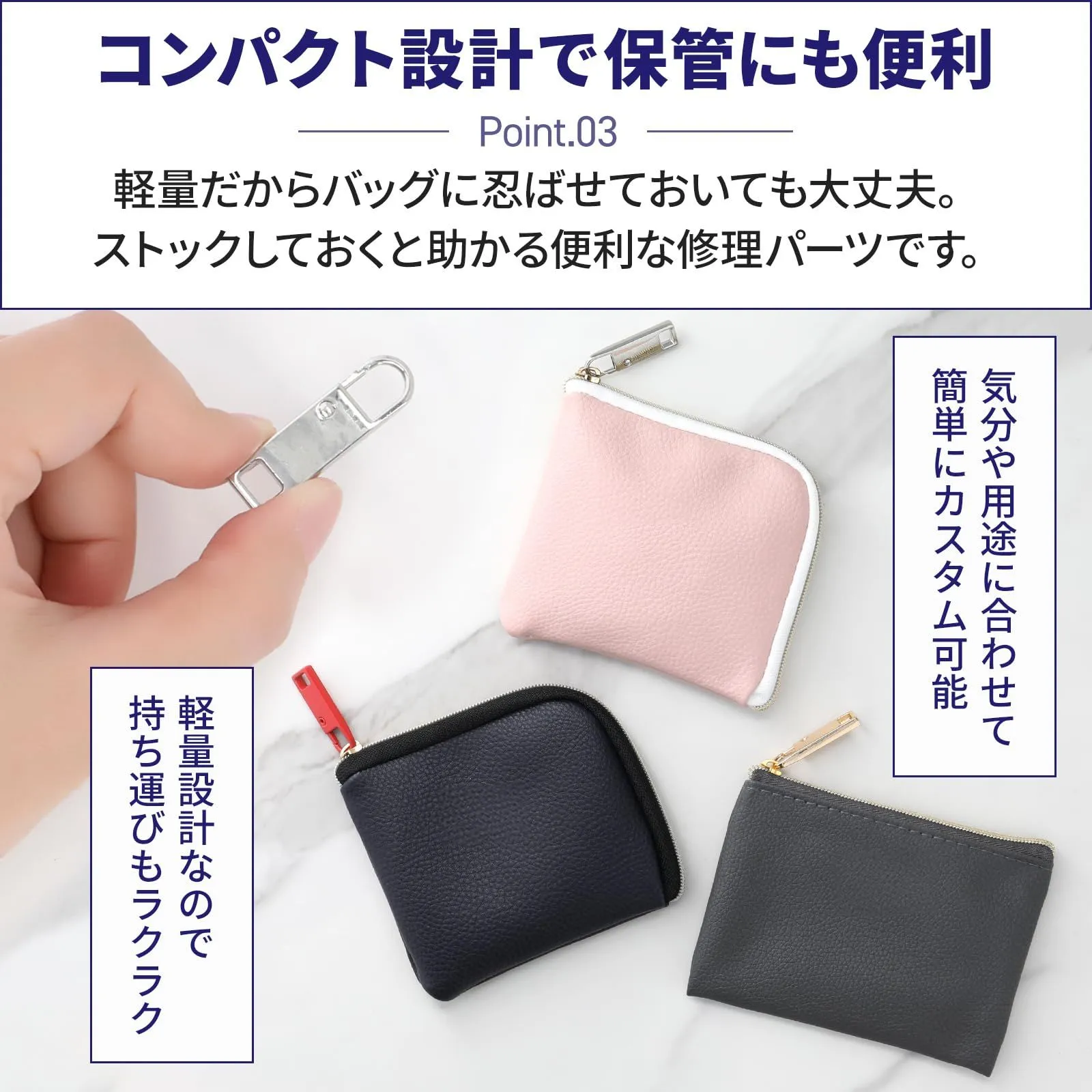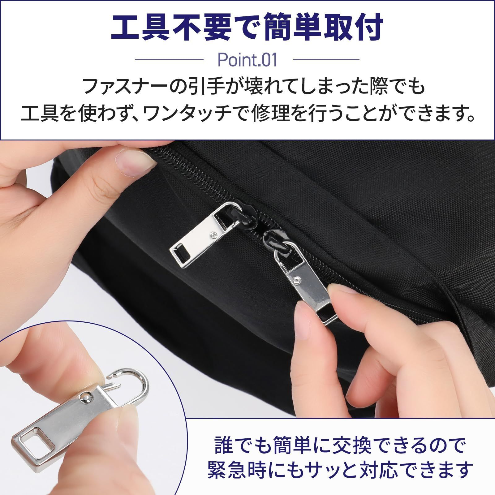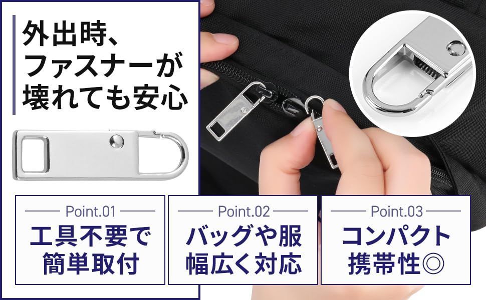 【工具不要で誰でも簡単】 壊れたファスナーもDactionのパーツでワンタッチ修理。 工具なしで交換できて、外出先でもすぐ対応できます。